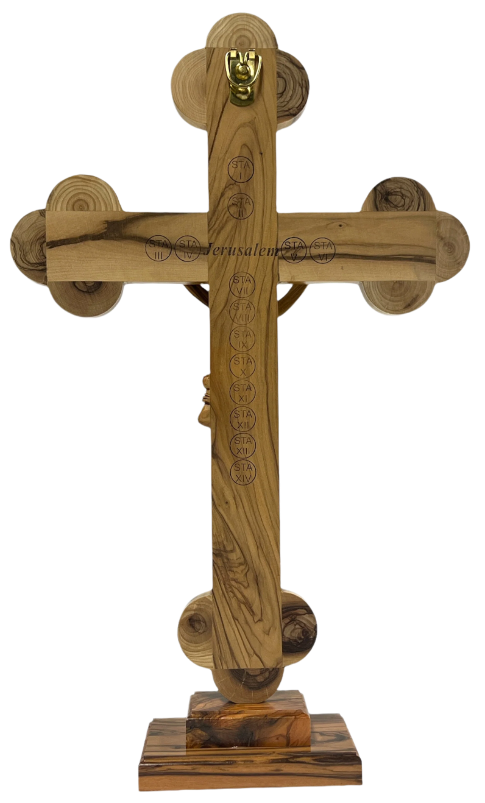 This handmade Roman Cross was made from Olive Wood from The Olive trees in Jerusalem, with a stand that allows you to have the option of hanging it or standing it. Inside the 4 Glasses are Olive leaves symbolizing olive oil and signify the death of Jesus on the cross, Frankincense to signify confirmation, Rocks from the Jordan River to signify Baptism, and Soil from Bethlehem symbolizes earth and signifies the Birth of Jesus.