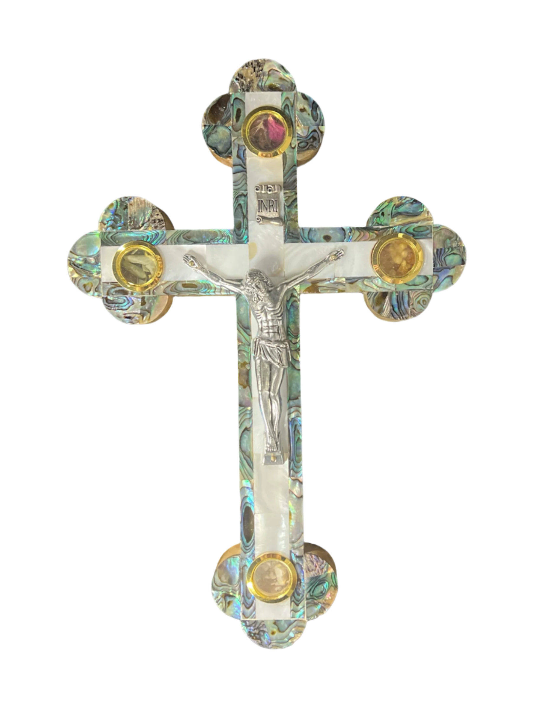 This handmade Roman Cross was made from Olive Wood from The Olive trees in Jerusalem, Covered in mother of pearl.
