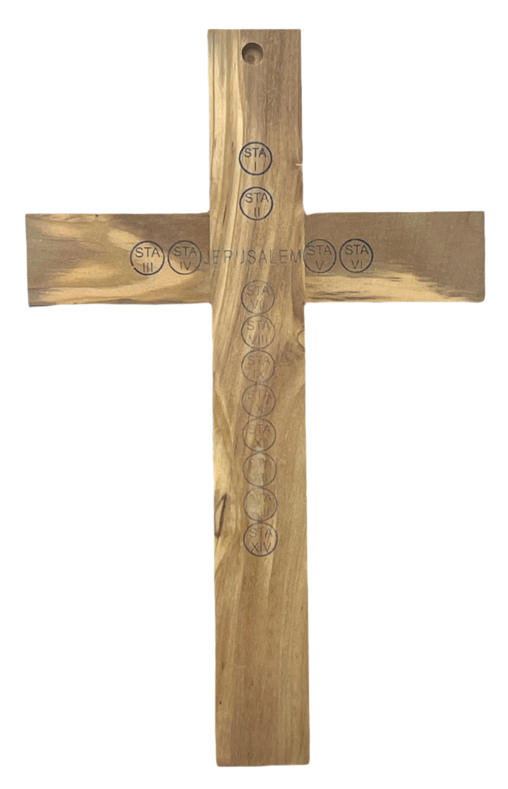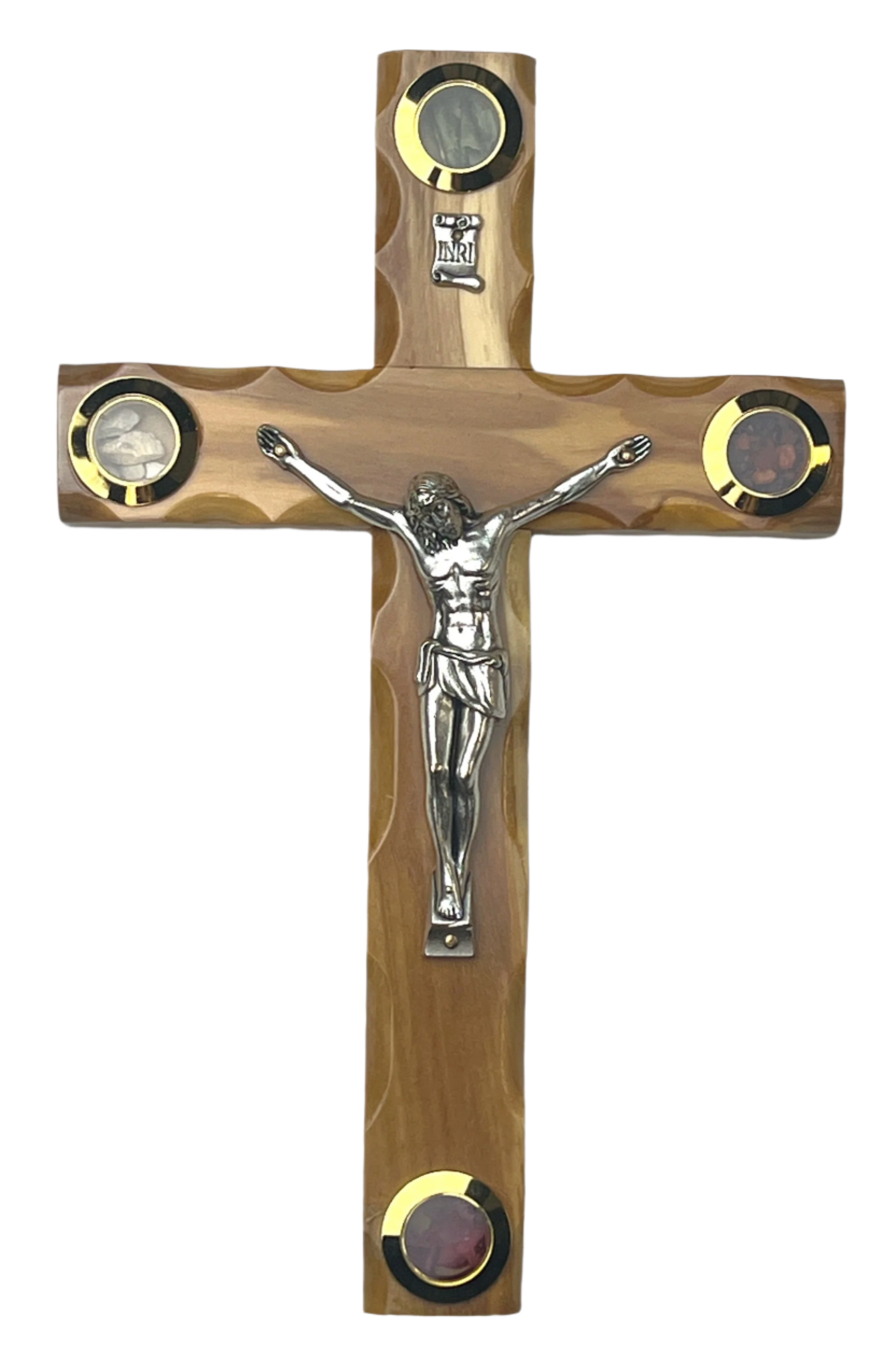 This handmade Latin Cross was made from Olive Wood from The Olive trees in Jerusalem. Inside the 4 Glasses are Olive leaves symbolizing olive oil and signify the death of Jesus on the cross, Frankincense to signify confirmation, Rocks from the Jordan River to signify Baptism, and Soil from Bethlehem symbolizes earth and signifies the Birth of Jesus.