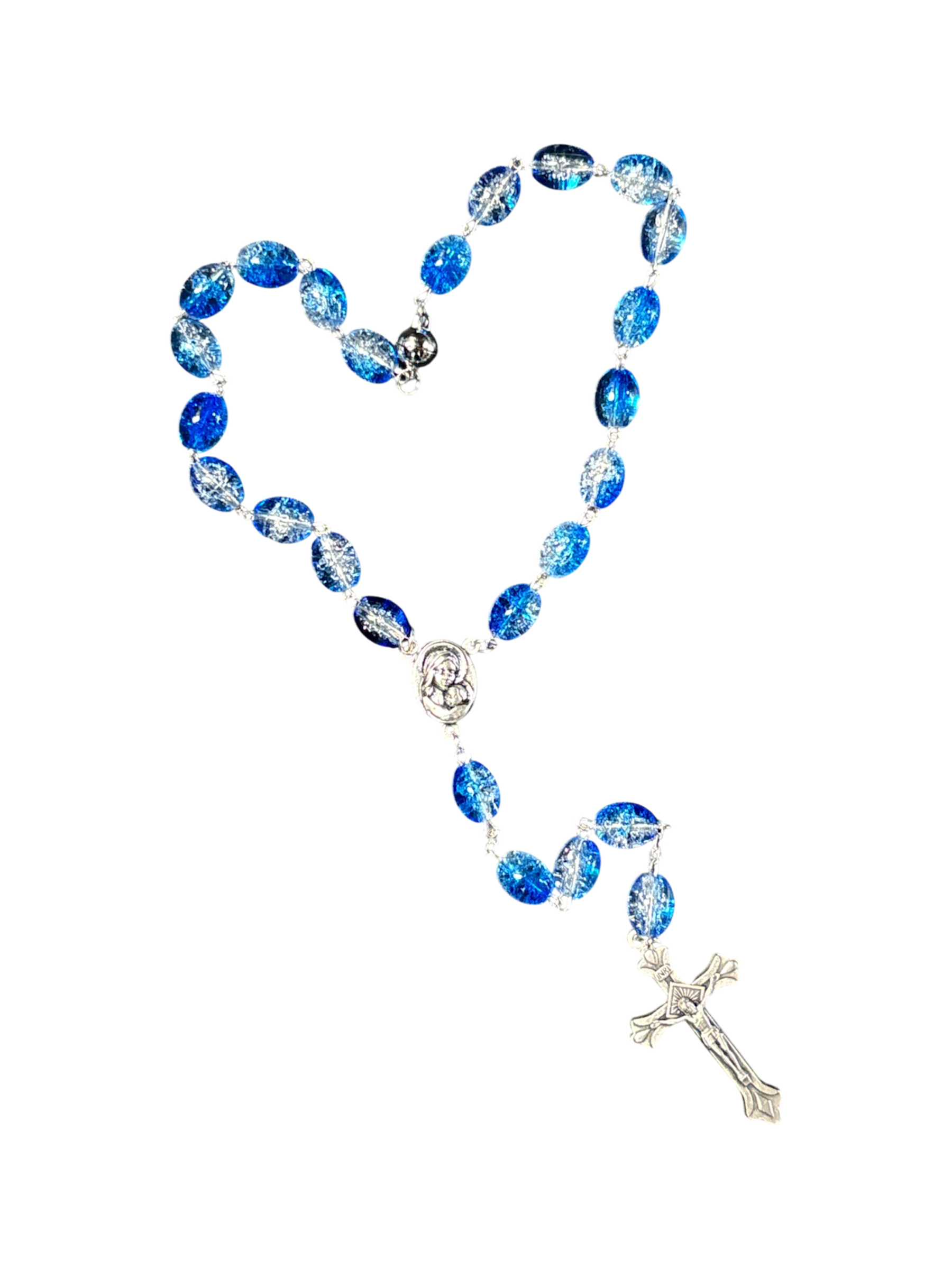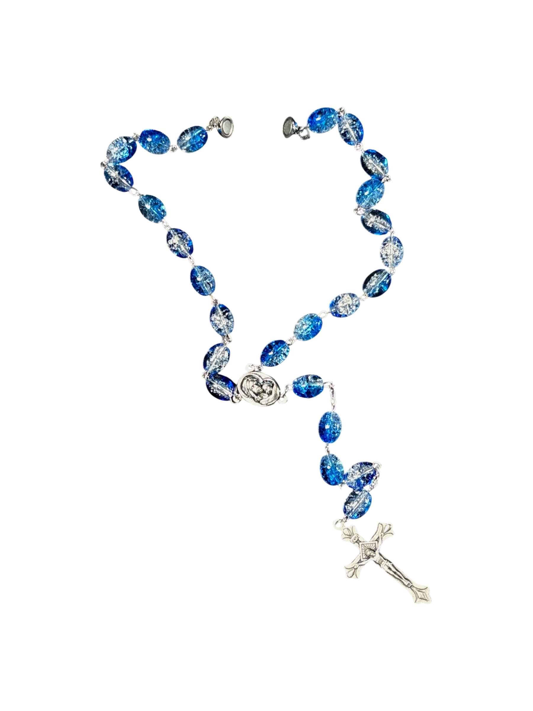 A Beautiful handmade Crystal Blue Car Rosary. Hand Crafted by Christian’s in Jerusalem. These Car Rosaries are shorter than regular rosaries and has a small magnet to make it easy to hang in your car