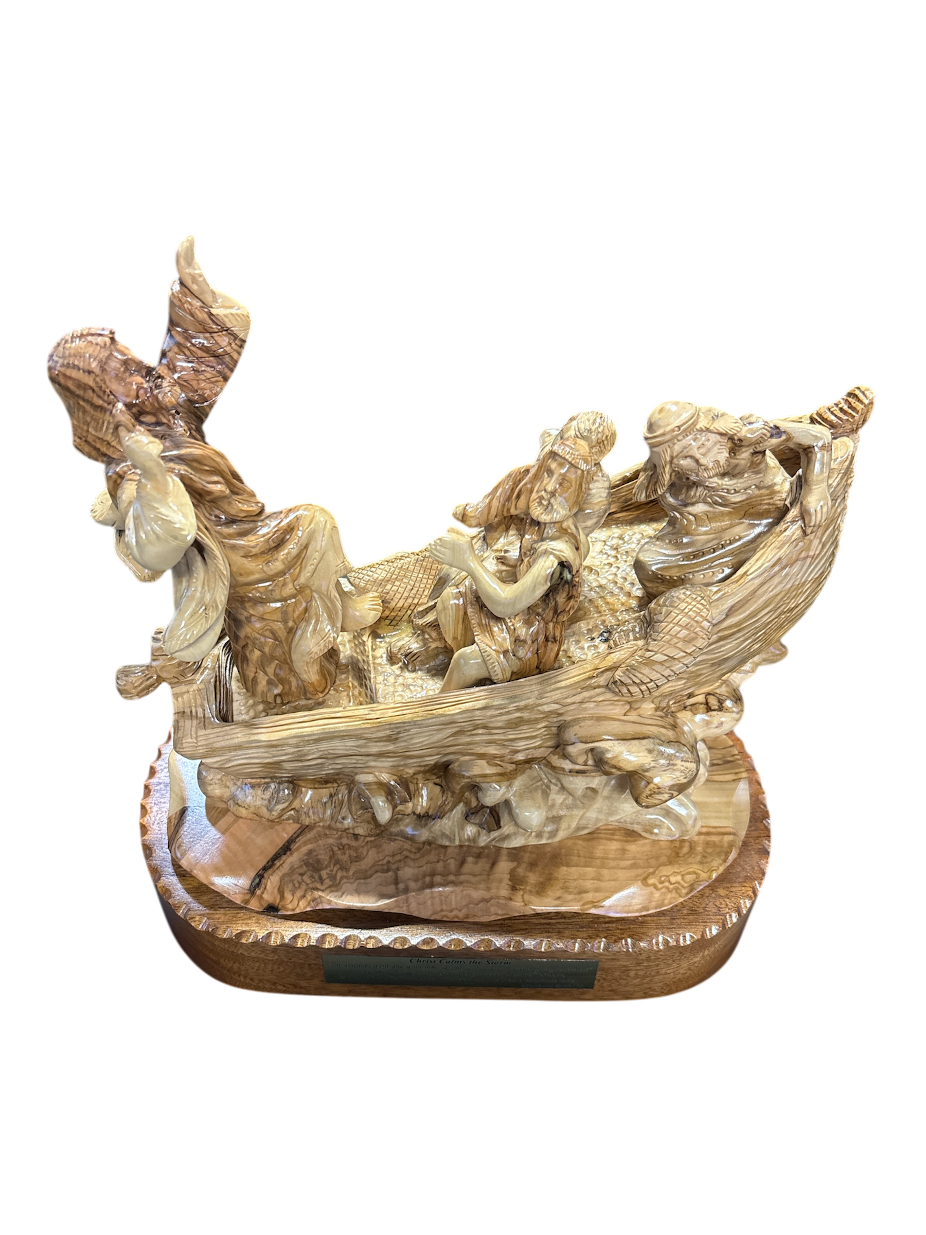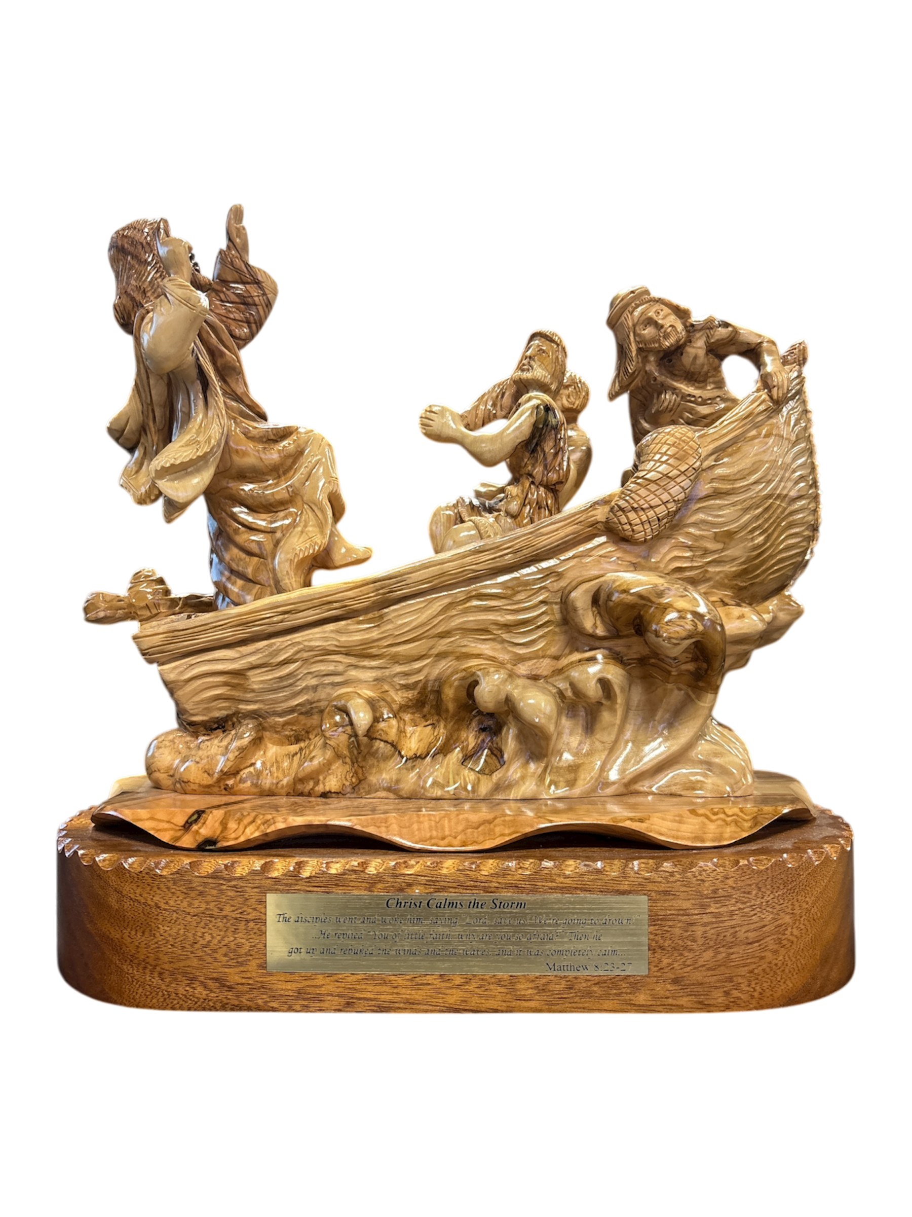 A beautiful detailed Christ Calms the Storm. Hand Carved by Christians in Jerusalem. The wood they use is the Olive Wood from the Olive Trees. Included is a gold plaque that has Matthew 8:23-27 verse.