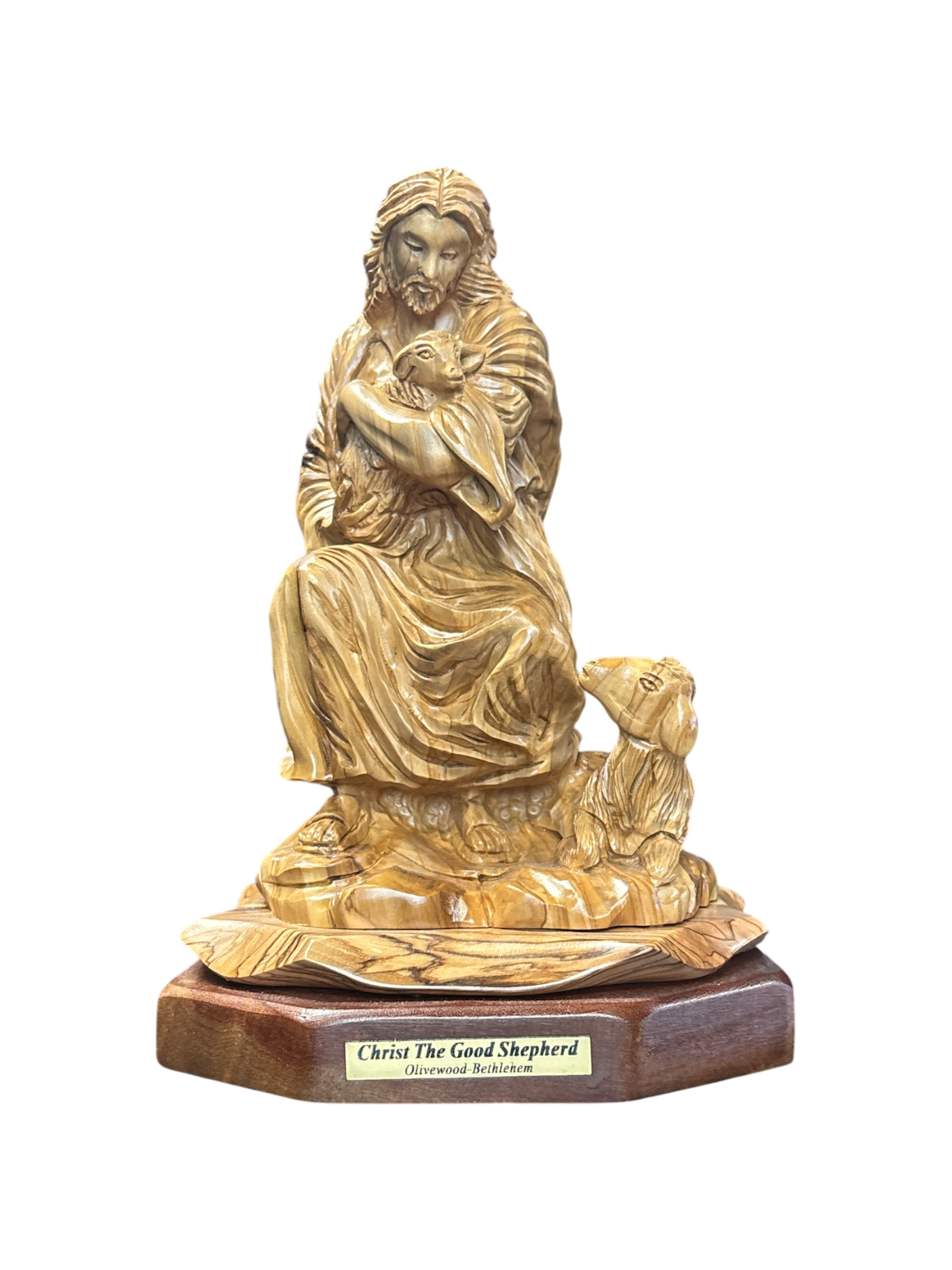 A beautiful Hand Carved Detailed Good Shepard Statue. The wood the artists use is the Olive Wood from the Holy Olive Trees.