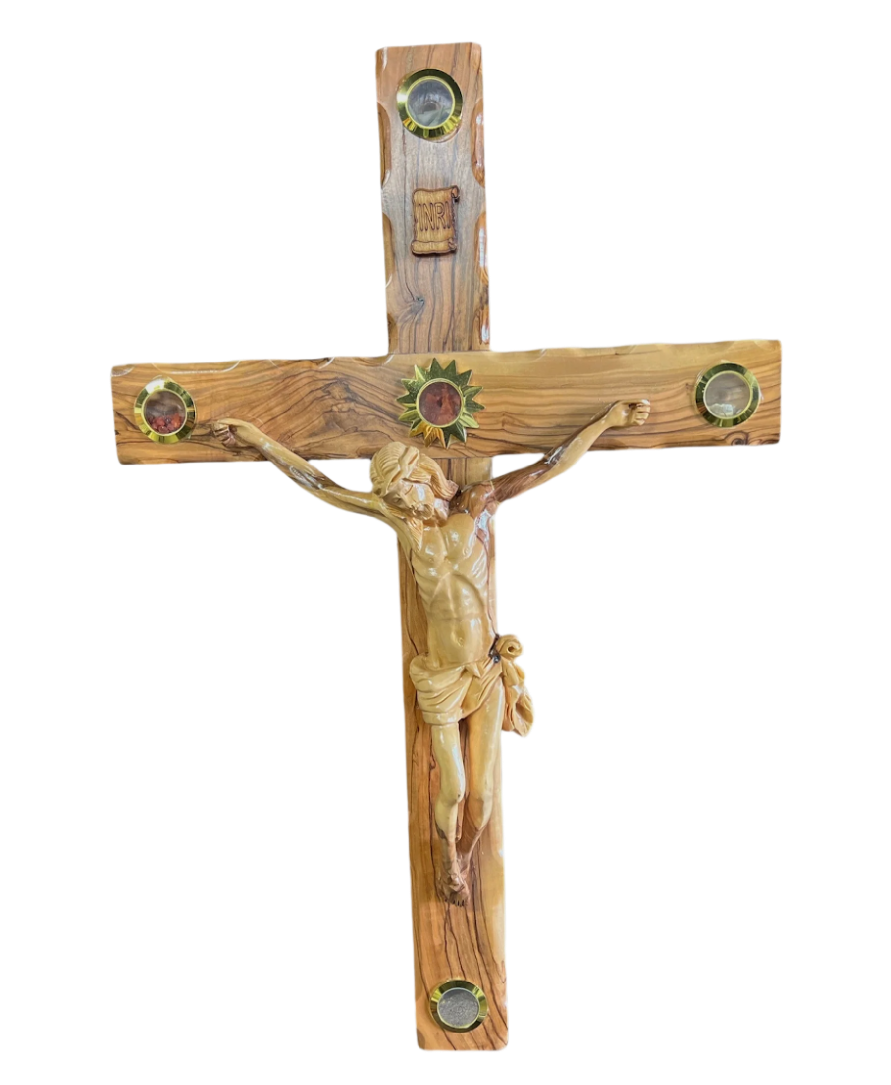 This handmade Latin Cross was made from Olive Wood from The Olive trees in Jerusalem. Inside the 4 Glasses are Olive leaves symbolizing olive oil and signify the death of Jesus on the cross, Frankincense to signify confirmation, Rocks from the Jordan River to signify Baptism, and Soil from Bethlehem symbolizes earth and signifies the Birth of Jesus