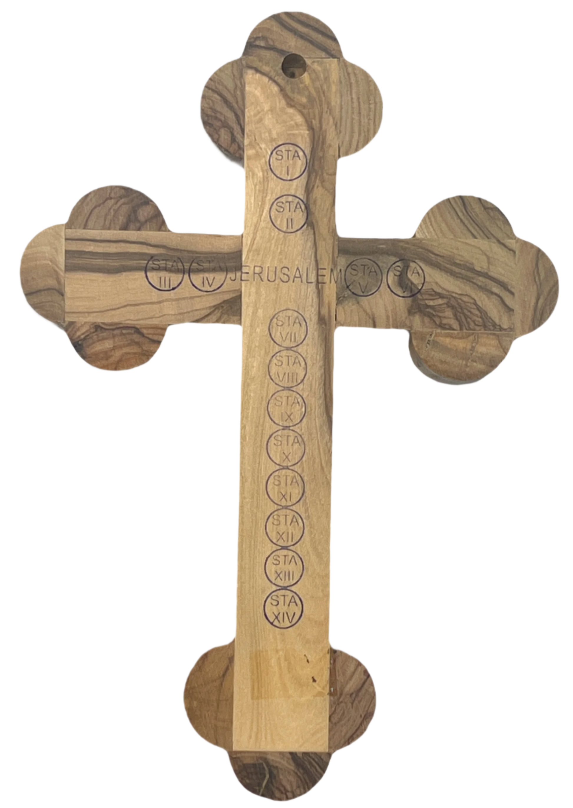 This handmade Roman Cross was made from Olive Wood from The Olive trees in Jerusalem. Inside the 4 Glasses are Olive leaves symbolizing olive oil and signify the death of Jesus on the cross, Frankincense to signify confirmation, Rocks from the Jordan River to signify Baptism, and Soil from Bethlehem symbolizes earth and signifies the Birth of Jesus.