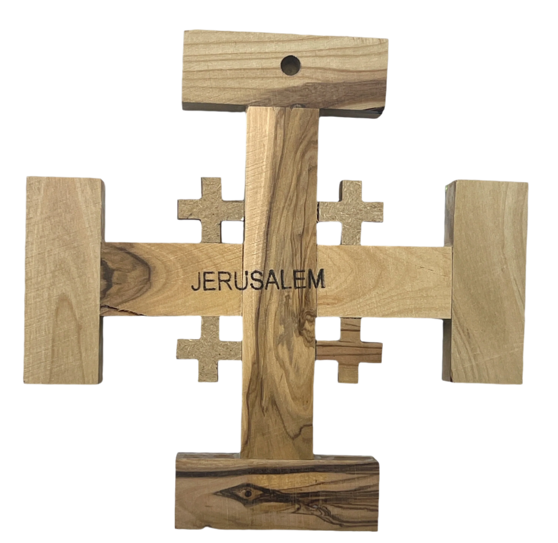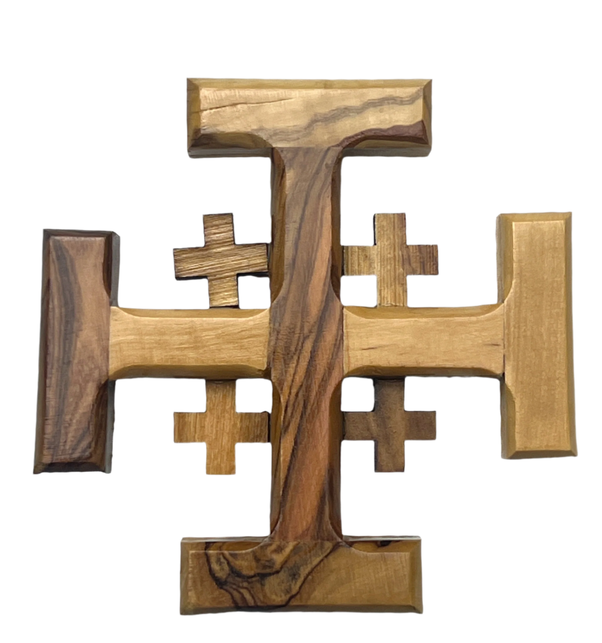 This handmade Jerusalem Cross was made from Olive Wood from The Olive trees in Jerusalem.
