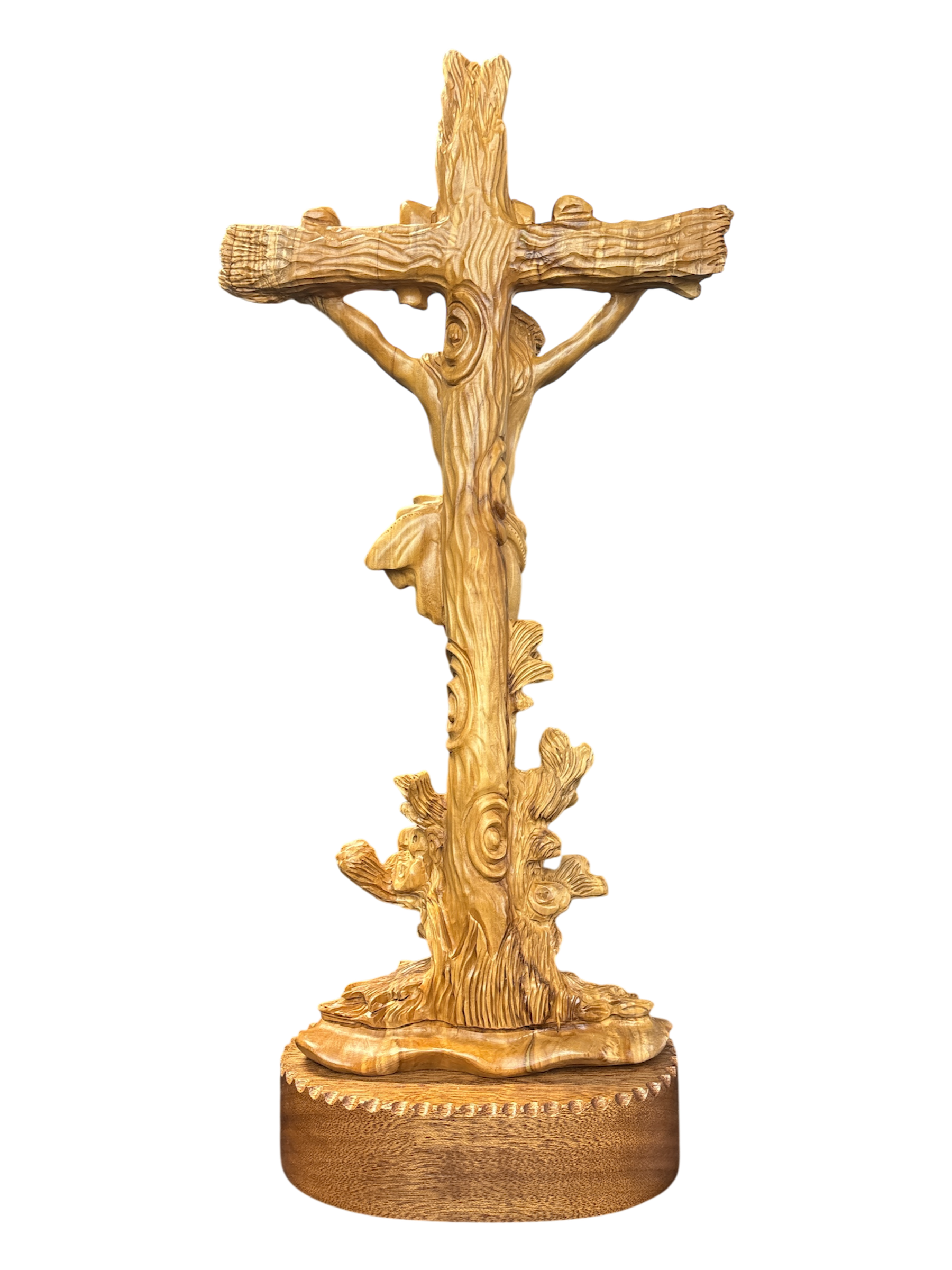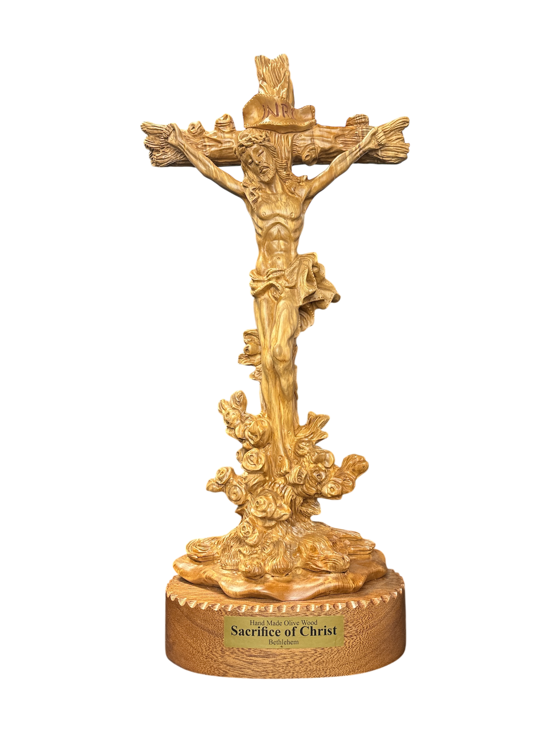 A beautiful Hand Carved Detailed Crucifixion. The wood the artists use is the Olive Wood from the Holy Olive Trees.
