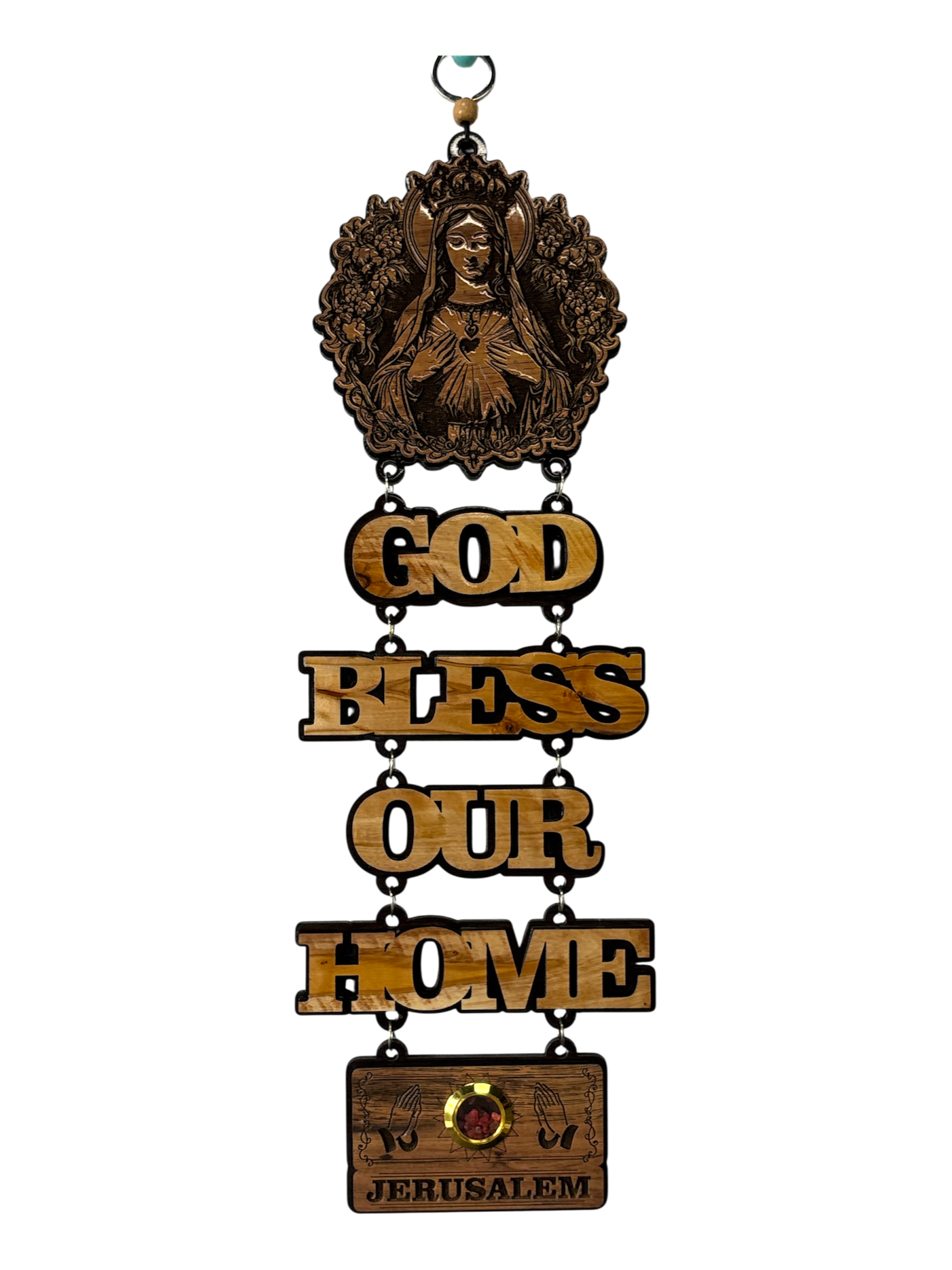 Carved by hand in Jerusalem, this laser engraved God Bless our Home wall hanging is made of the branches of the Holy Olive Tree and includes Virgin Mary, frankincense on the bottom.