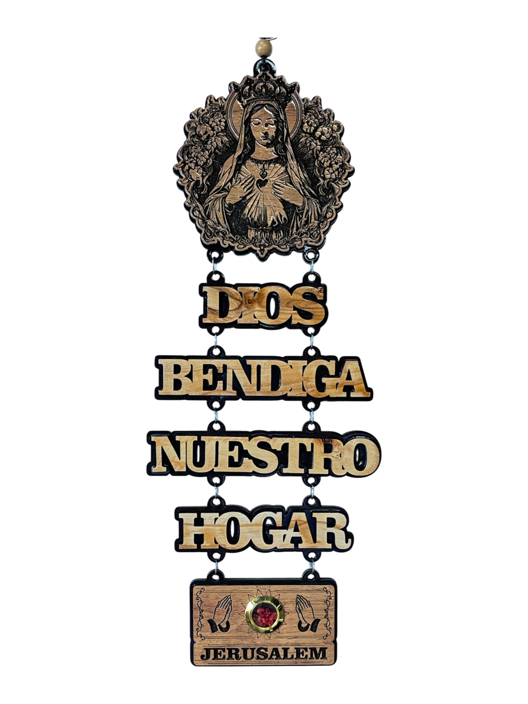 Carved by hand in Jerusalem, this laser engraved God Bless our Home wall hanging is made of the branches of the Holy Olive Tree and includes Virgin Mary, frankincense on the bottom.