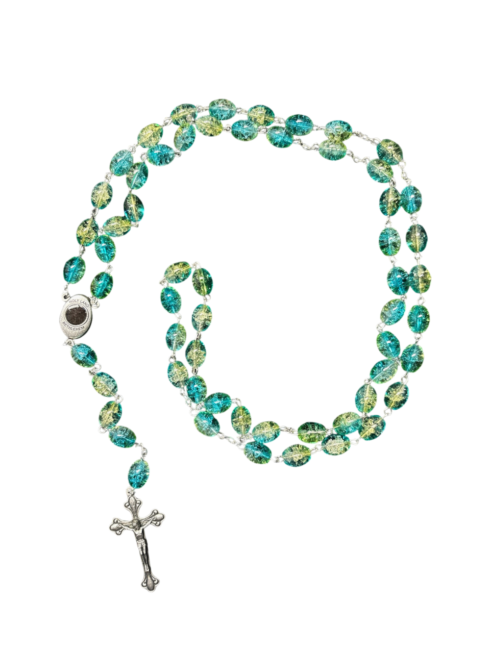 Handmade Green and Teal crystal Rosary from Jerusalem , Crafted by Christians in The Holy Land.