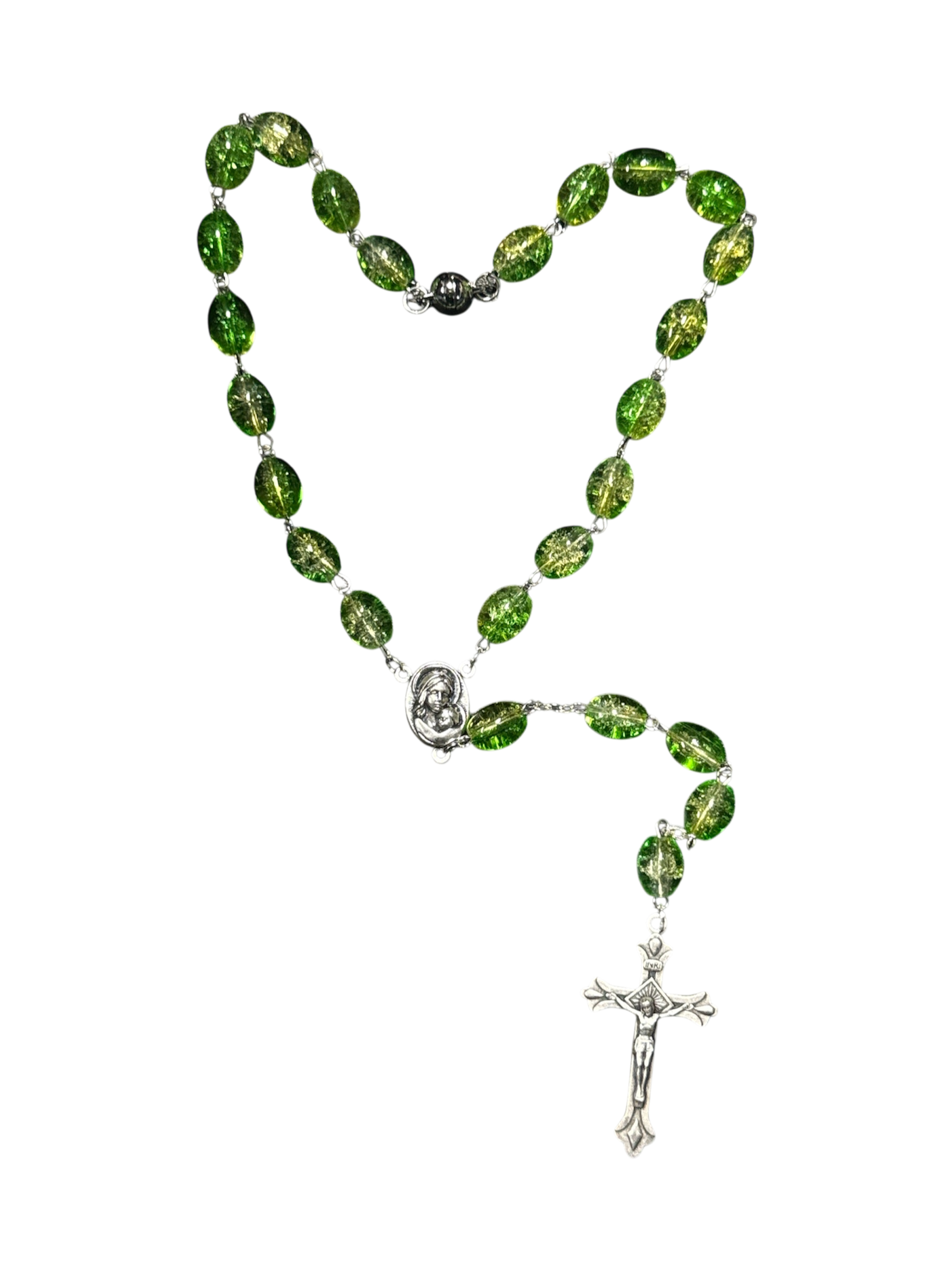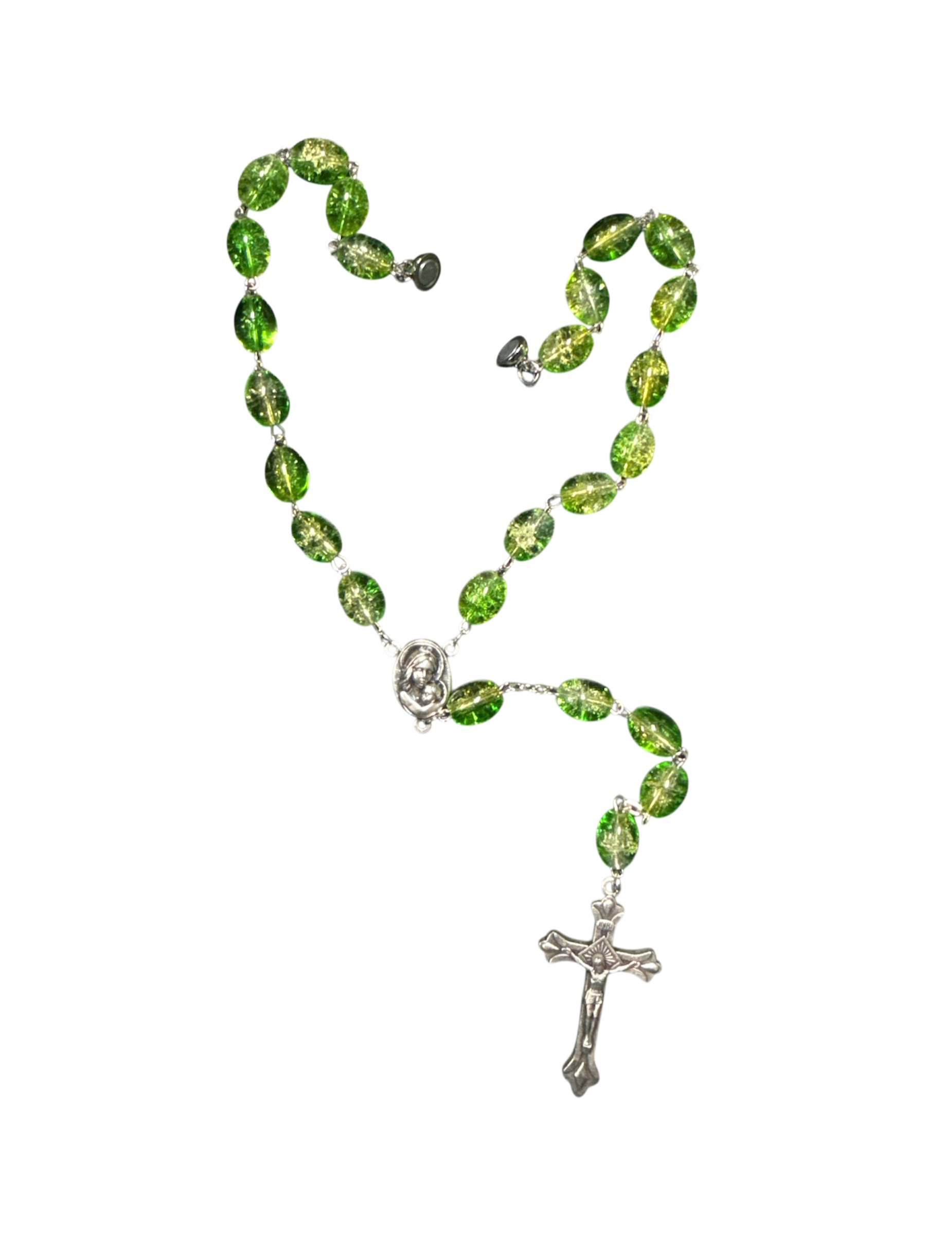 A Beautiful handmade Crystal Green Car Rosary. Hand Crafted by Christian’s in Jerusalem. These Car Rosaries are shorter than regular rosaries and has a small magnet to make it easy to hang in your car.