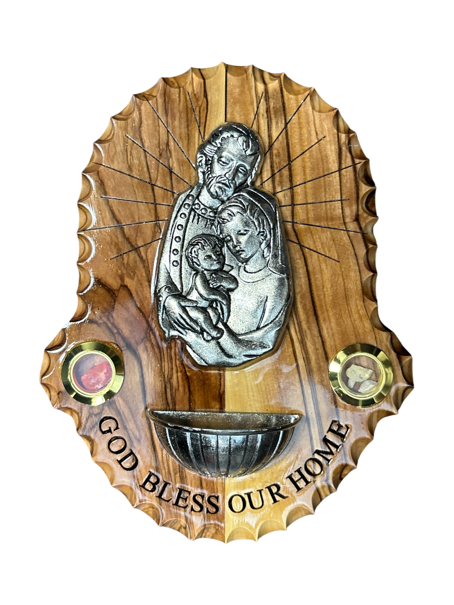 Carved by hand in Jerusalem, This Beautiful wall hanging is made from the branches of the Holy Olive Tree and includes a Holy Family Metal piece, It includes a small tray to hold holy water or holy oil as well as Frankincense from Jerusalem and Rocks from the Jordan River.