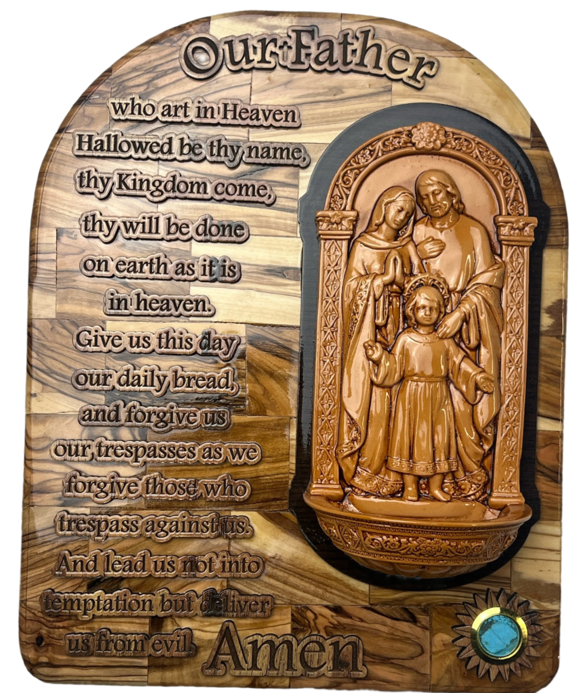 hand carved Lord prayer plate made from olive wood. The Plate has a place for it to hold holy water and also has frankincense lower bottom corner.