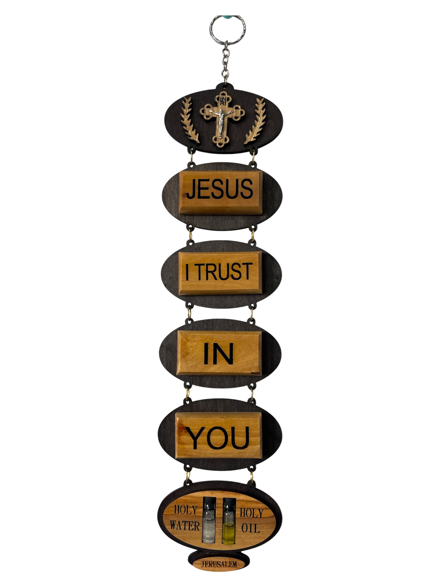 Carved by hand in Jerusalem, this laser engraved “Jesus I Trust In You” wall hanging is made of the branches of the Holy Olive Tree and includes a crucifix, Holy Oil from Jerusalem and Blessed Holy Water from the Jordan River.