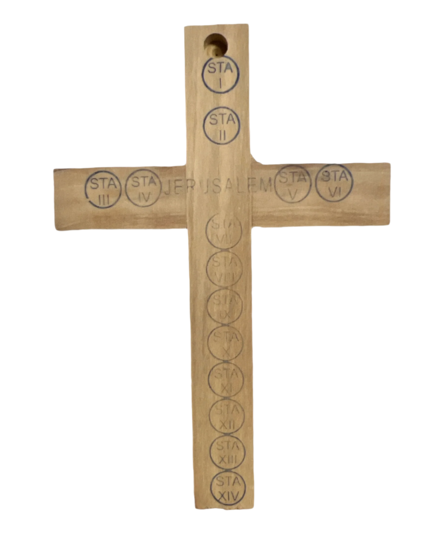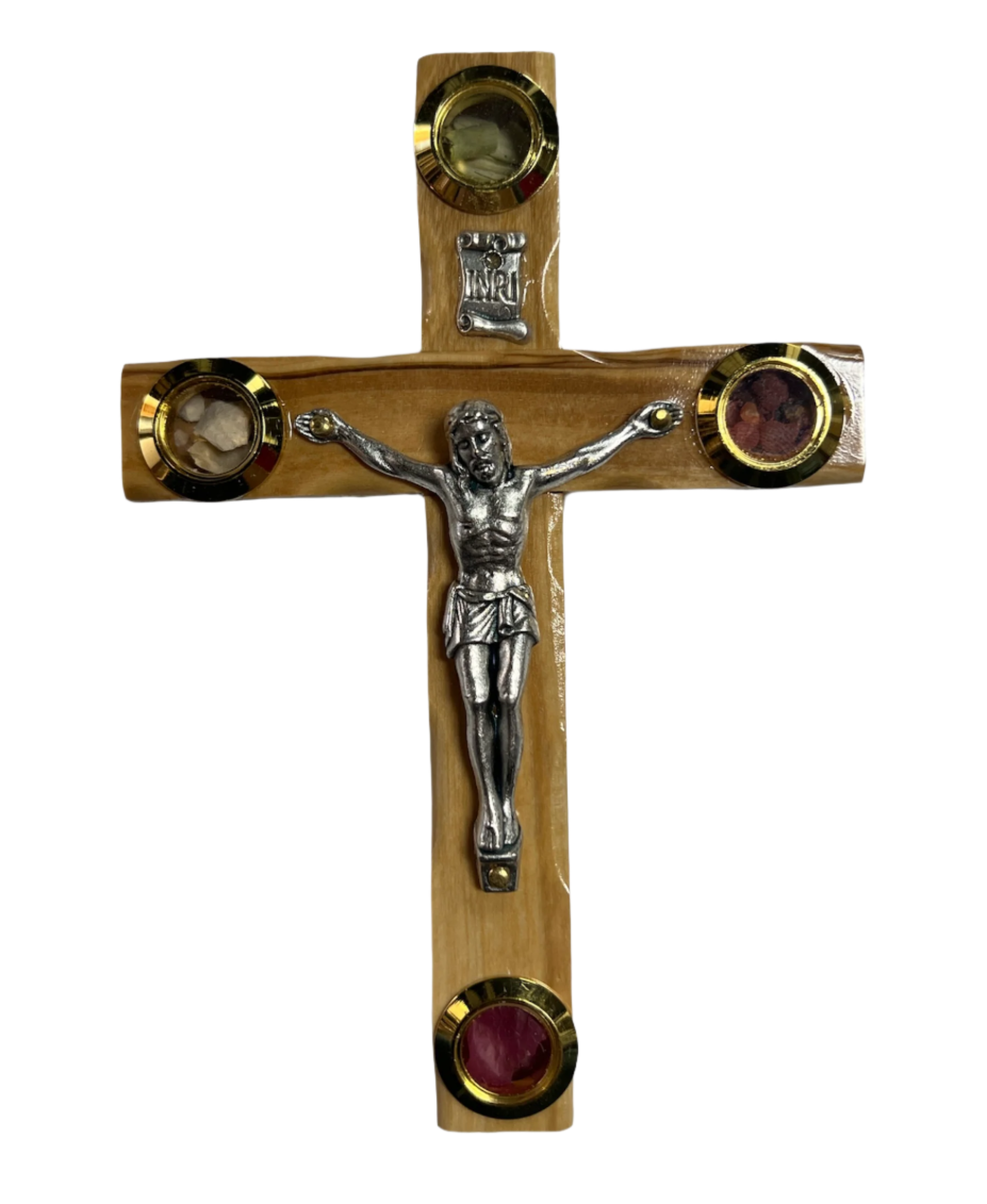This handmade Latin Cross was made from Olive Wood from The Olive trees in Jerusalem. Inside the 4 Glasses are Olive leaves symbolizing olive oil and signify the death of Jesus on the cross, Frankincense to signify confirmation, Rocks from the Jordan River to signify Baptism, and Soil from Bethlehem symbolizes earth and signifies the Birth of Jesus.