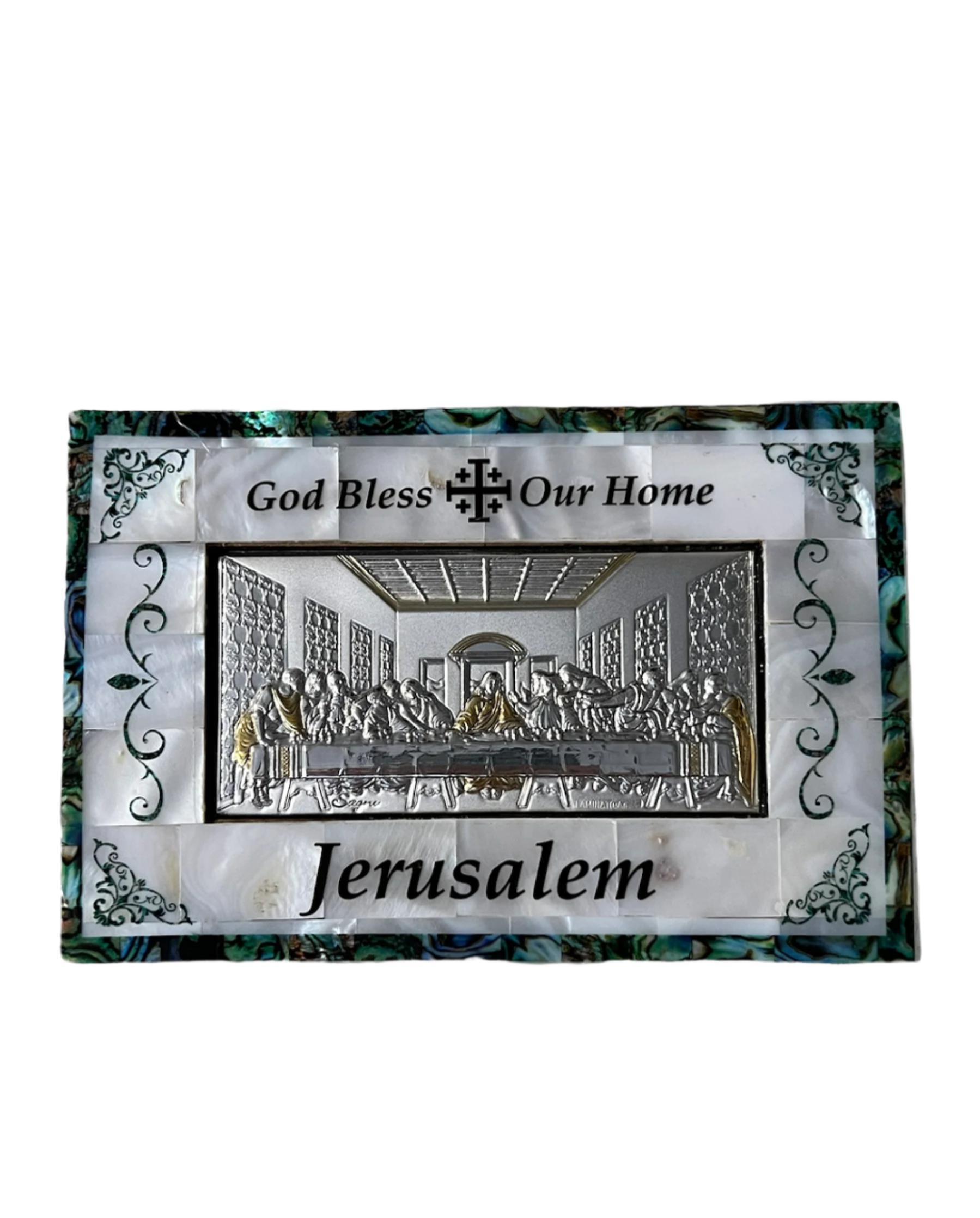 A beautiful Last Supper Plate. The Special wood that is used is the Olive Wood from the Olive Trees in Bethlehem, Sea green and White Mother of Pearl.