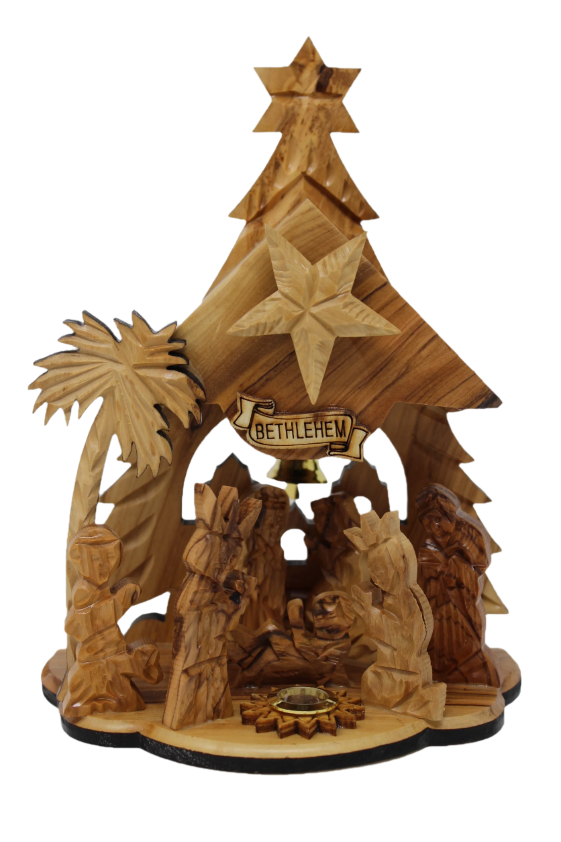 Handmade Nativity Set with Music box. Made by Christians in Jerusalem. The Music box is the Star. The song that plays from the Music Box is "Silent Night."