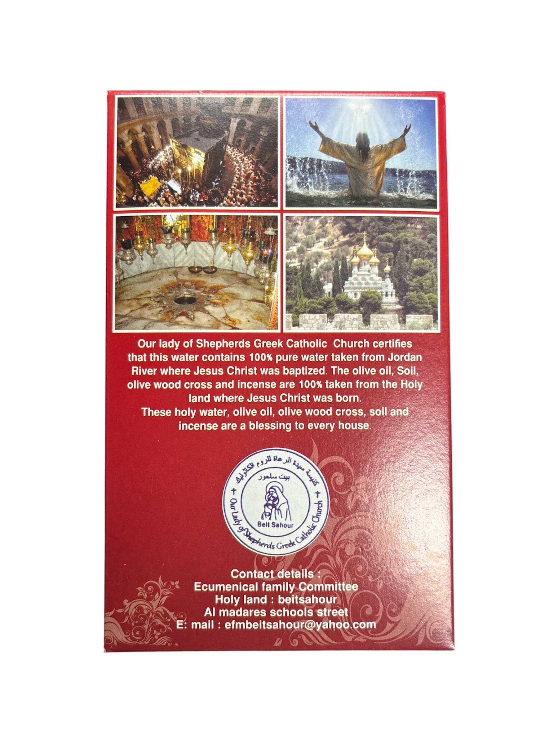 "Our lady of Shepards Greek Catholic Church certifies that this water contains 100% pure water taken from Jordan River where Jesus was baptized. The Olive Oil, Soil, olive wood cross and incense are 100% taken from the Holy land where Jesus Christ was Born."