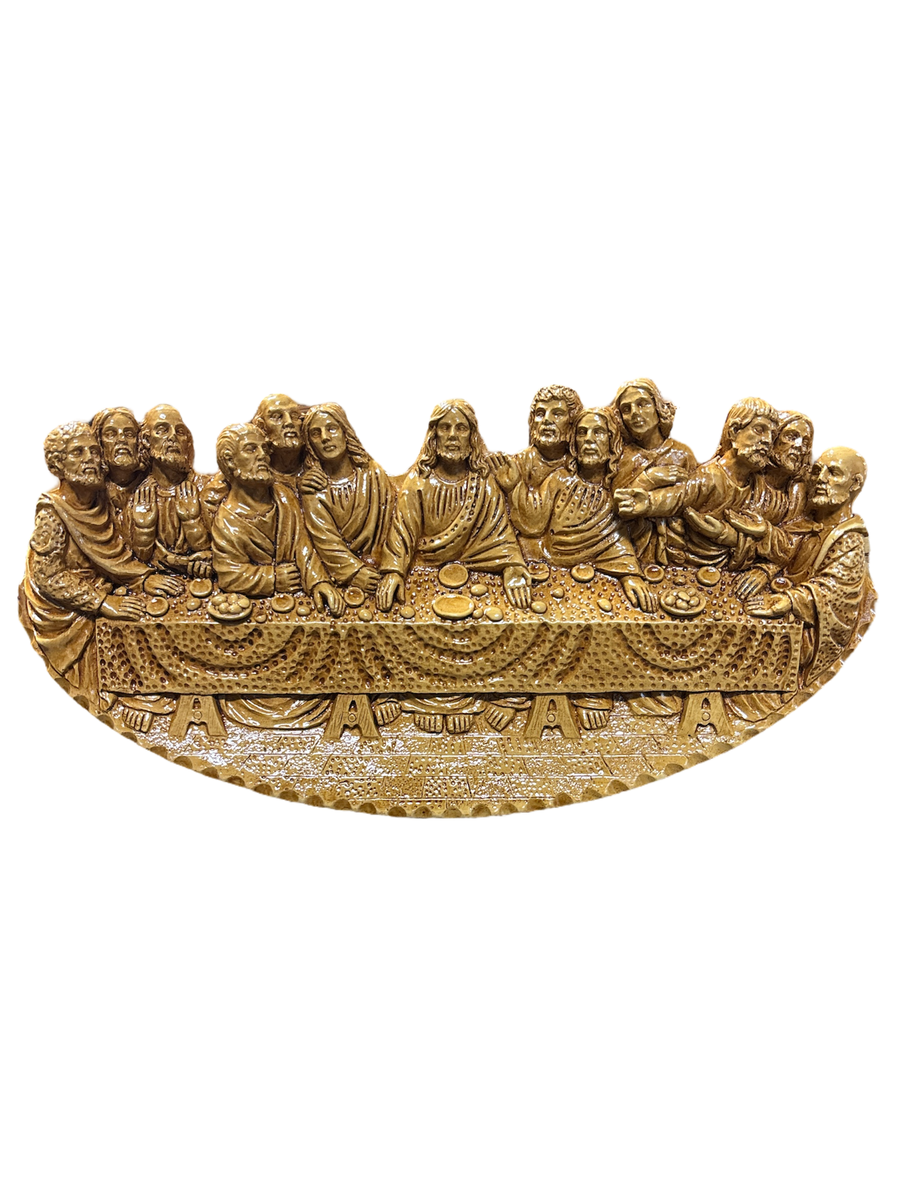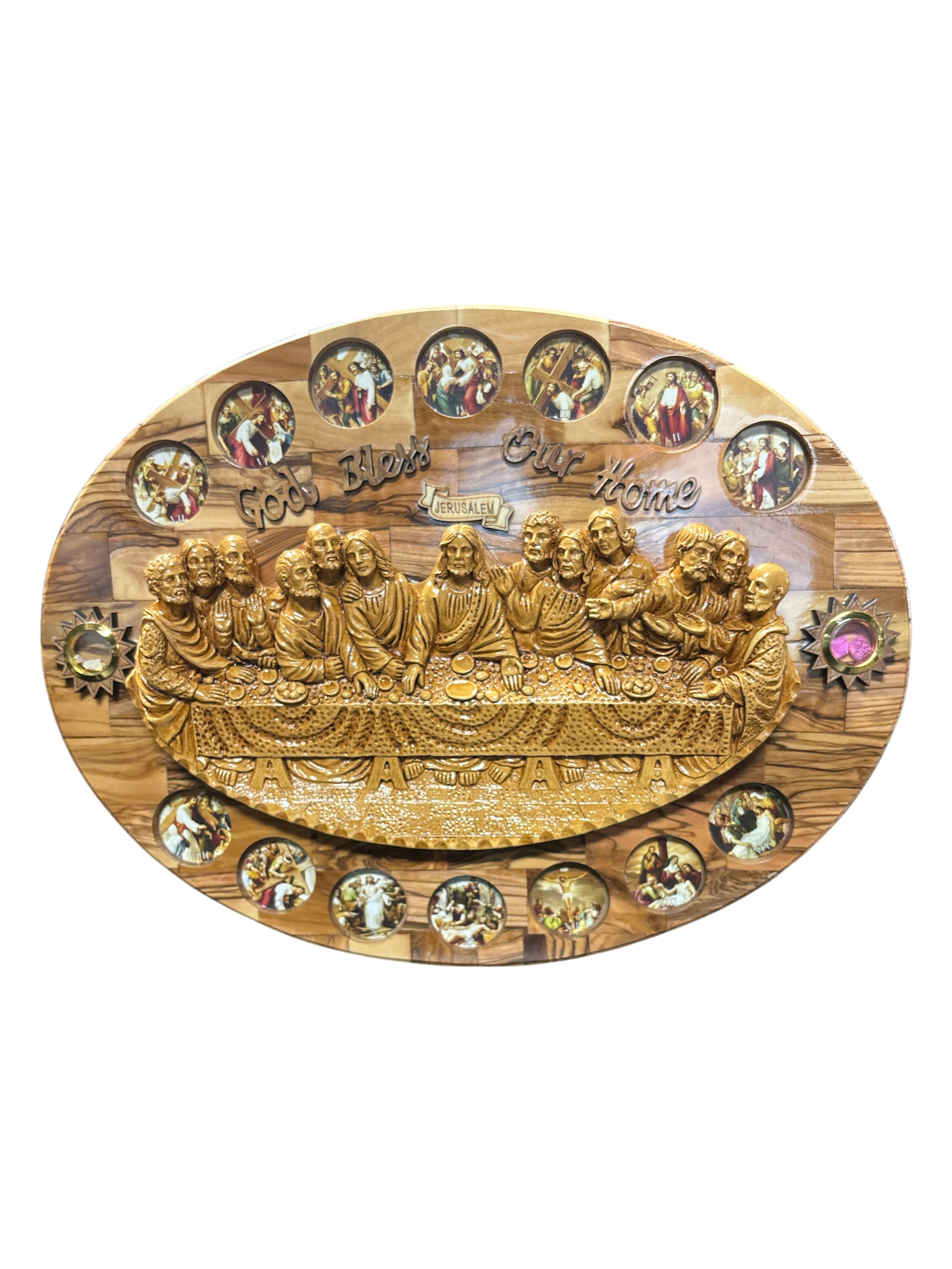 A beautiful Oval Last Supper Plate with the stations of the Cross. The Special wood that is used is the Olive Wood from the Olive Trees in Bethlehem, and Ceramic. Inside the little glass is frankincense and Rocks from the Jordan river.