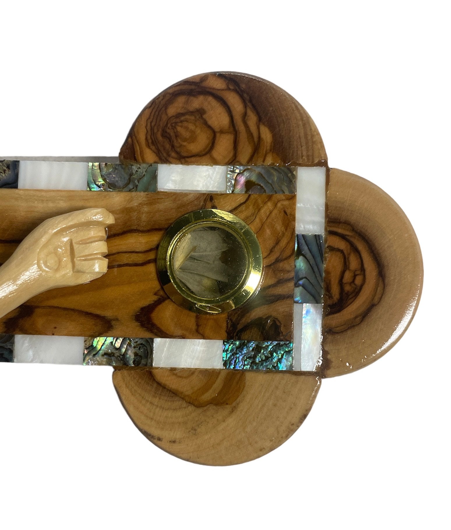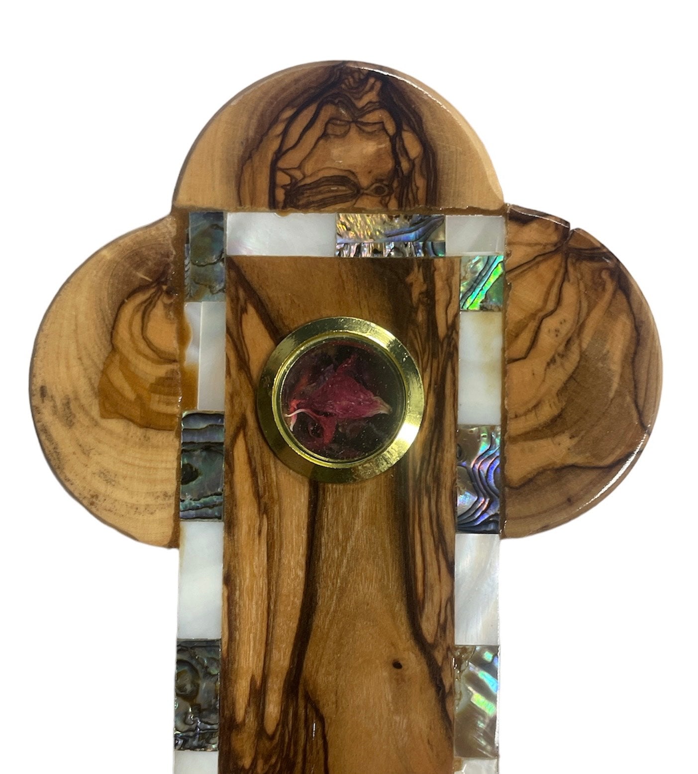 Mother of Pearl with White and Green Pearl. Made from holy olive oil wood. Inside the 4 Glasses are Olive leaves symbolizing olive oil and signify the death of Jesus on the cross, Frankincense to signify confirmation, Rocks from the Jordan River to signify Baptism, and Soil from Bethlehem symbolizes earth and signifies the Birth of Jesus