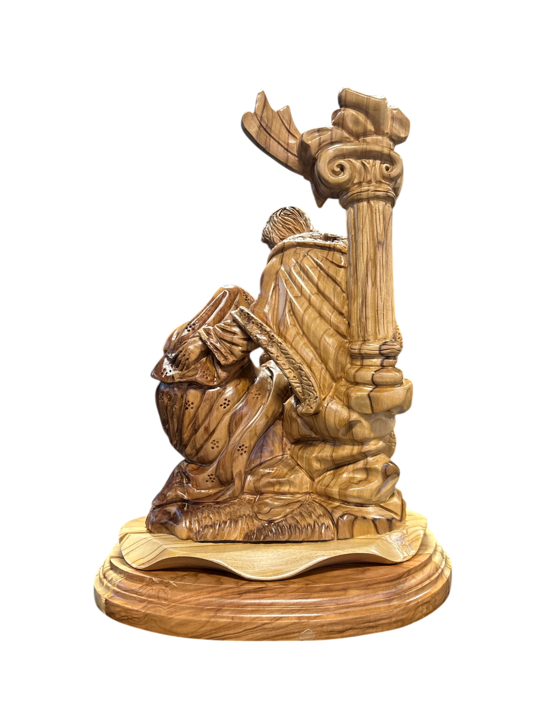 A beautiful hand Carved Sacred Holy Family sitting together after the birth of Jesus. Made with Olive Wood from the Olive Trees.