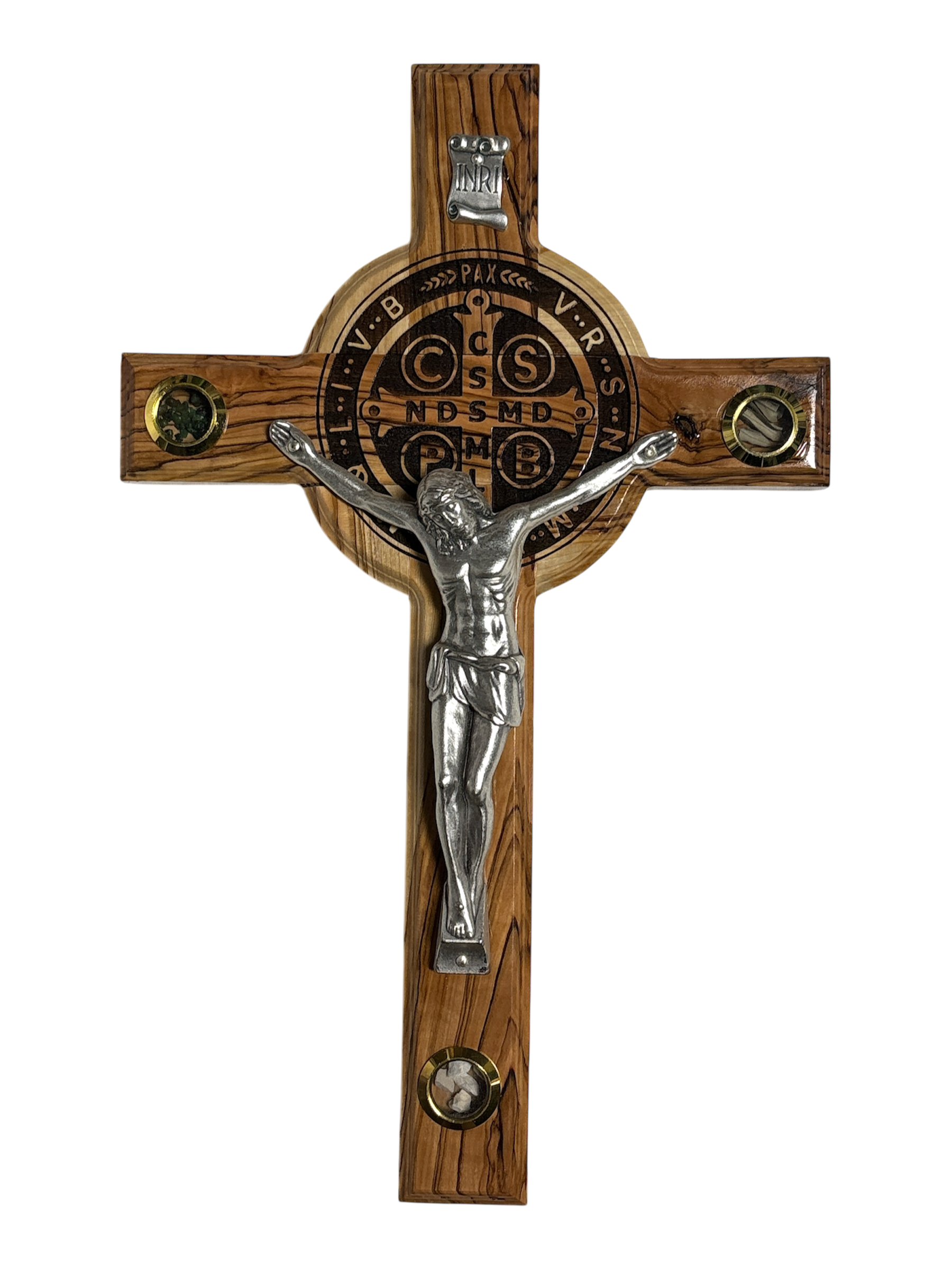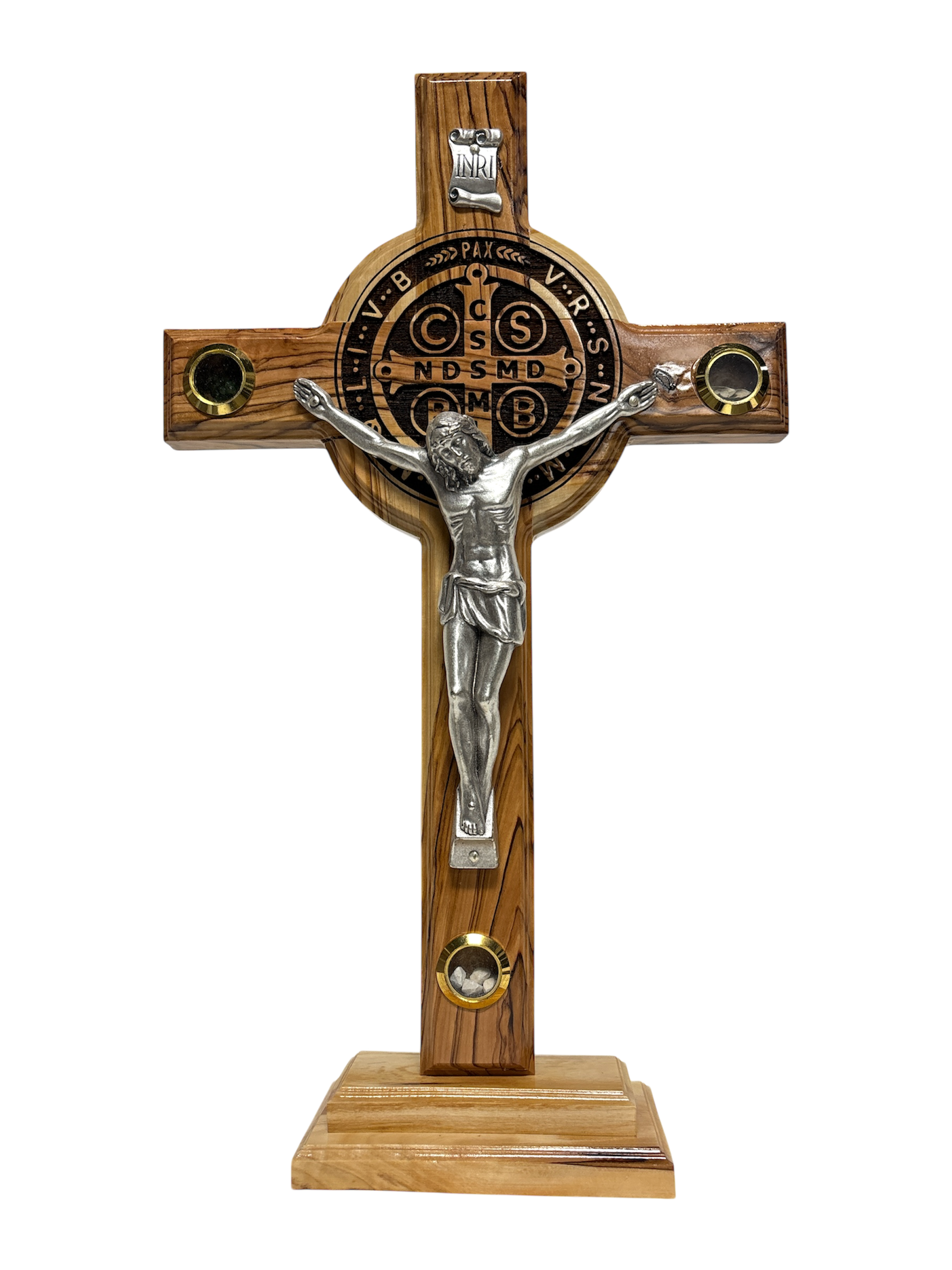 This handmade Saint Benedict Cross was made from Olive Wood from The Olive trees in Jerusalem. The Cross is hand Carved by Christians in Bethlehem. The stand at the bottom can be removed, and the cross can be hung.