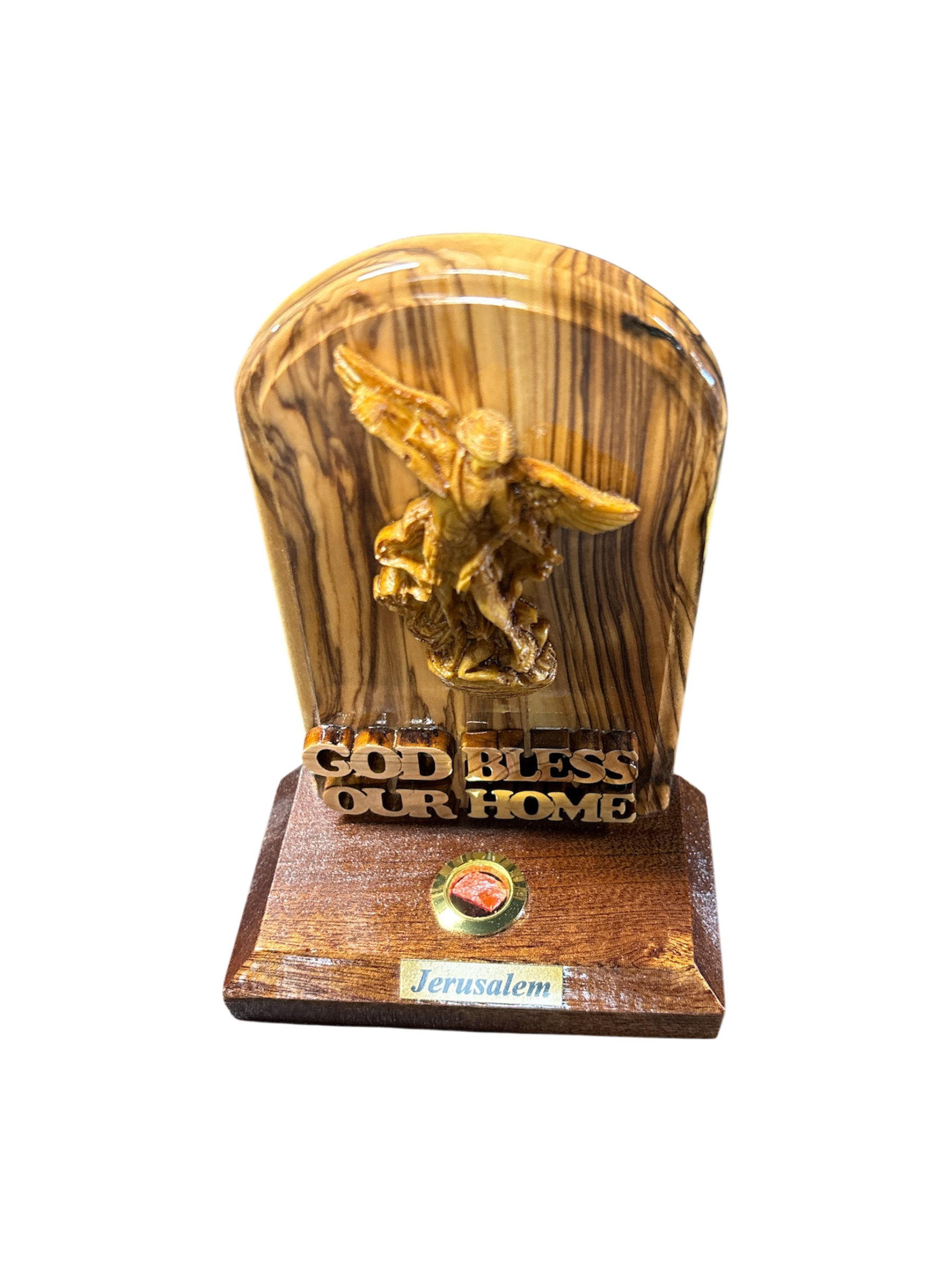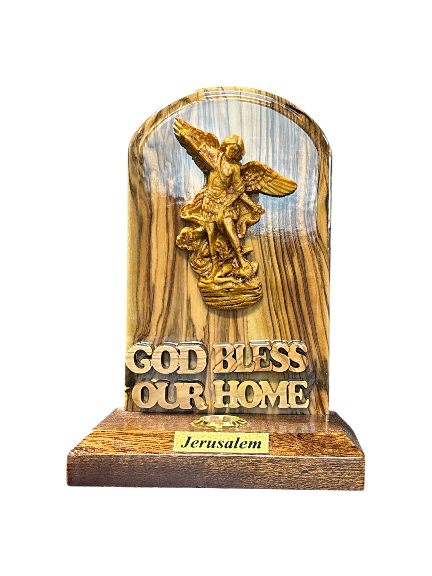A beautiful Hand Carved Saint Michael stand made by Christian families in Jerusalem, Carved from Olive wood from the Sacred Olive trees in the Holy Land. Saint Michael is made from Plaster and it also includes Frankincense.