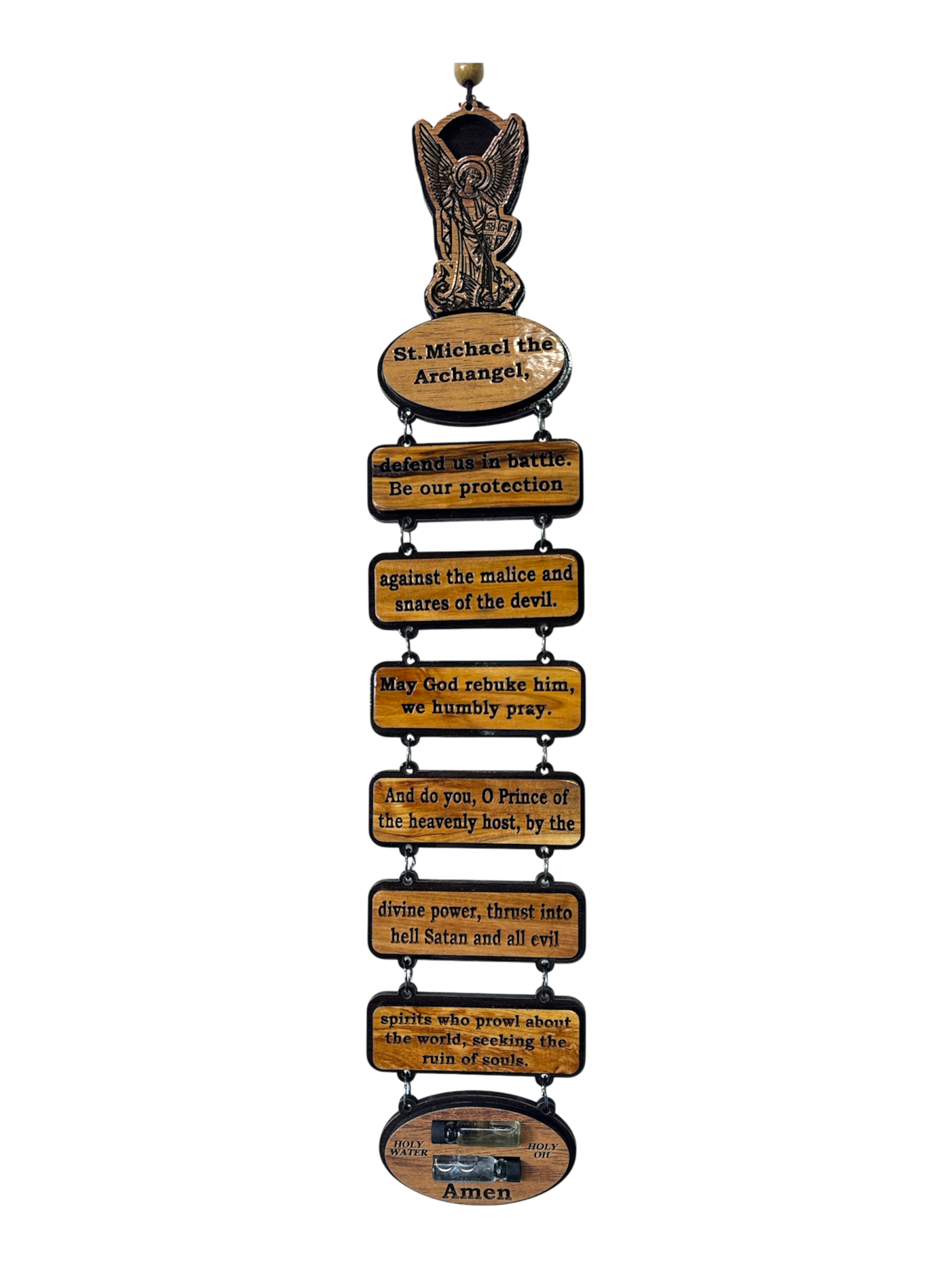 Carved by hand in Jerusalem, this laser engraved wall hanging is made of the branches of the Holy Olive Tree and includes a saint Michael picture., Holy Oil from Jerusalem and Blessed Holy Water from the Jordan River.