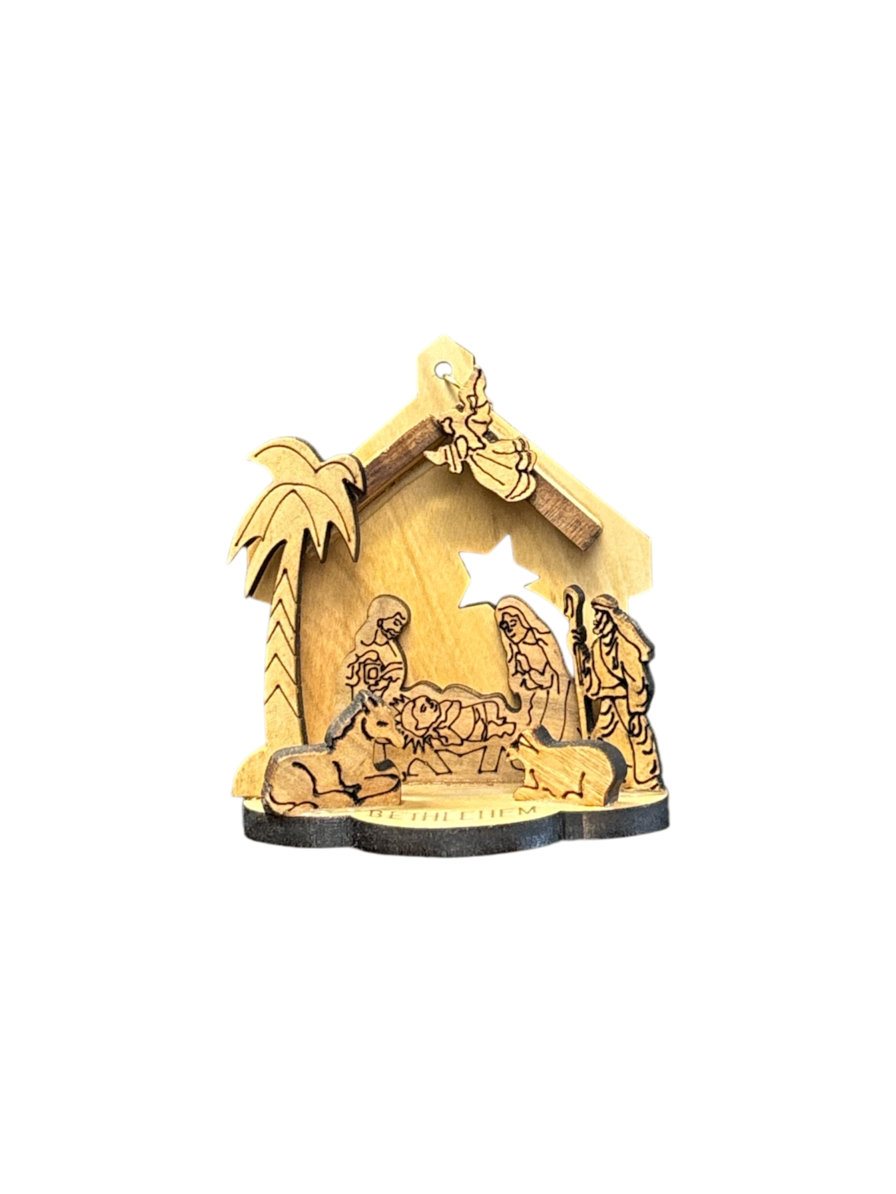 Small wood carving that represent the birth scene of peace, love and happiness. Perfect Christmas ornament. Small ring included to hang.