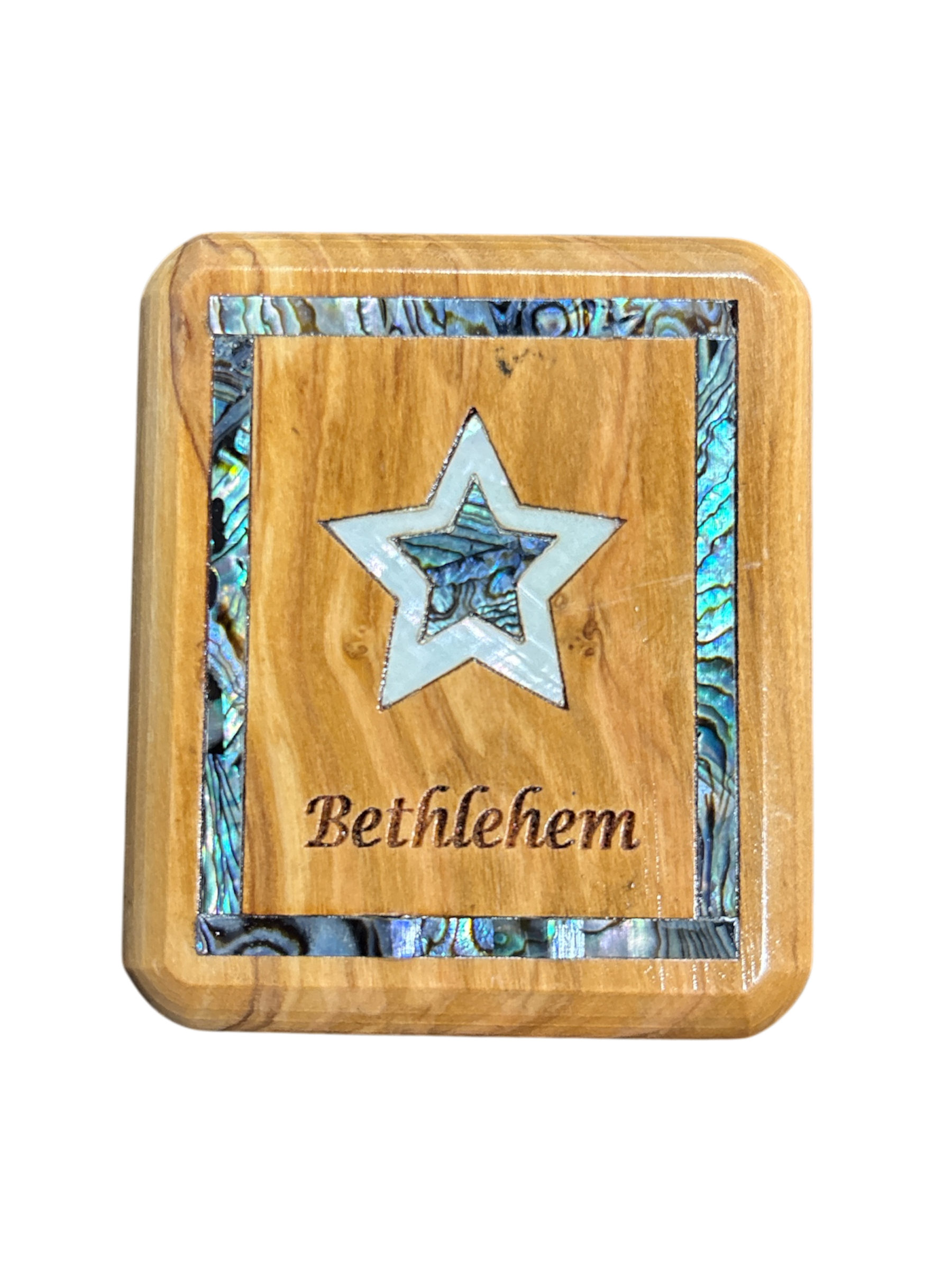 A handmade Jewelry box with a Bethlehem star on the top, made out of Hematite stone. This product was made by Christians in Jerusalem.
