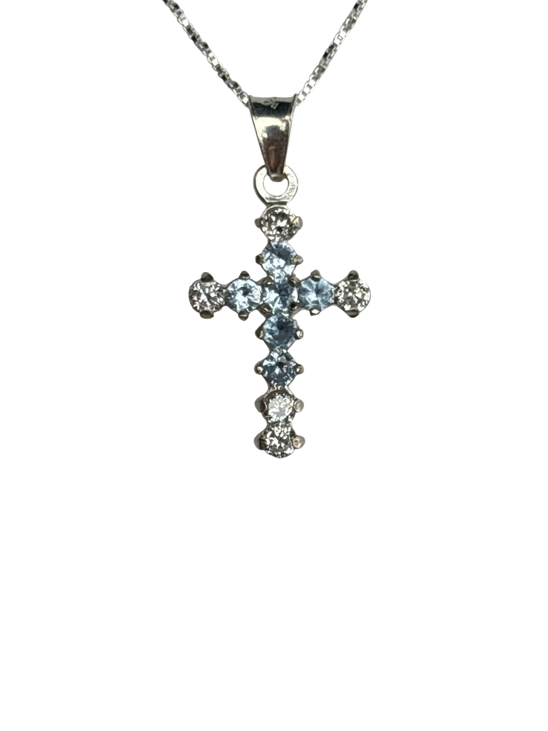 A beautiful Teal and White Gemstone Cross handmade by Christians in Jerusalem, with a 45 CM sterling silver Necklace.