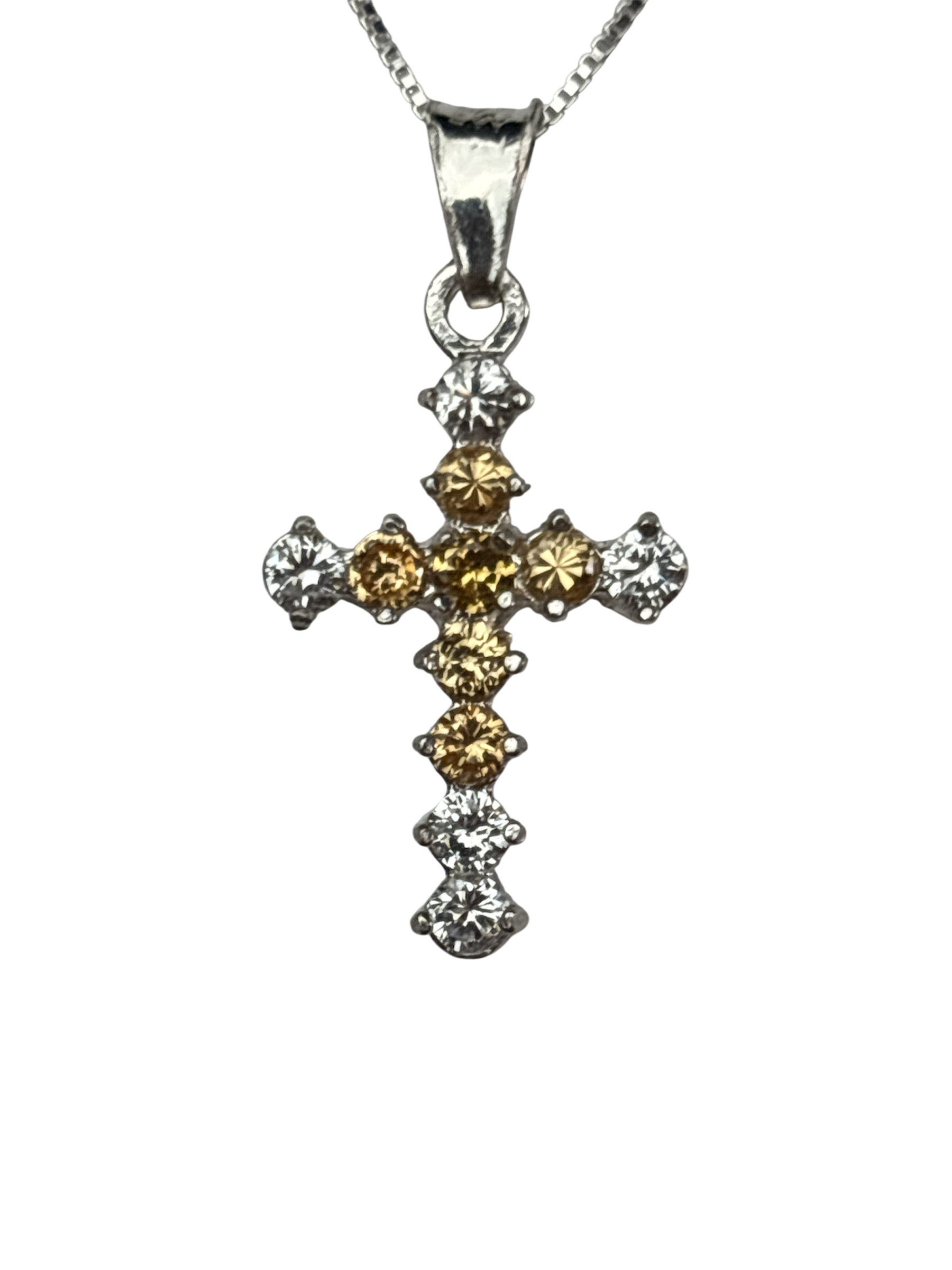A beautiful Yellow and white Gemstone Cross handmade by Christians in Jerusalem, with a 45 CM sterling silver Necklace.