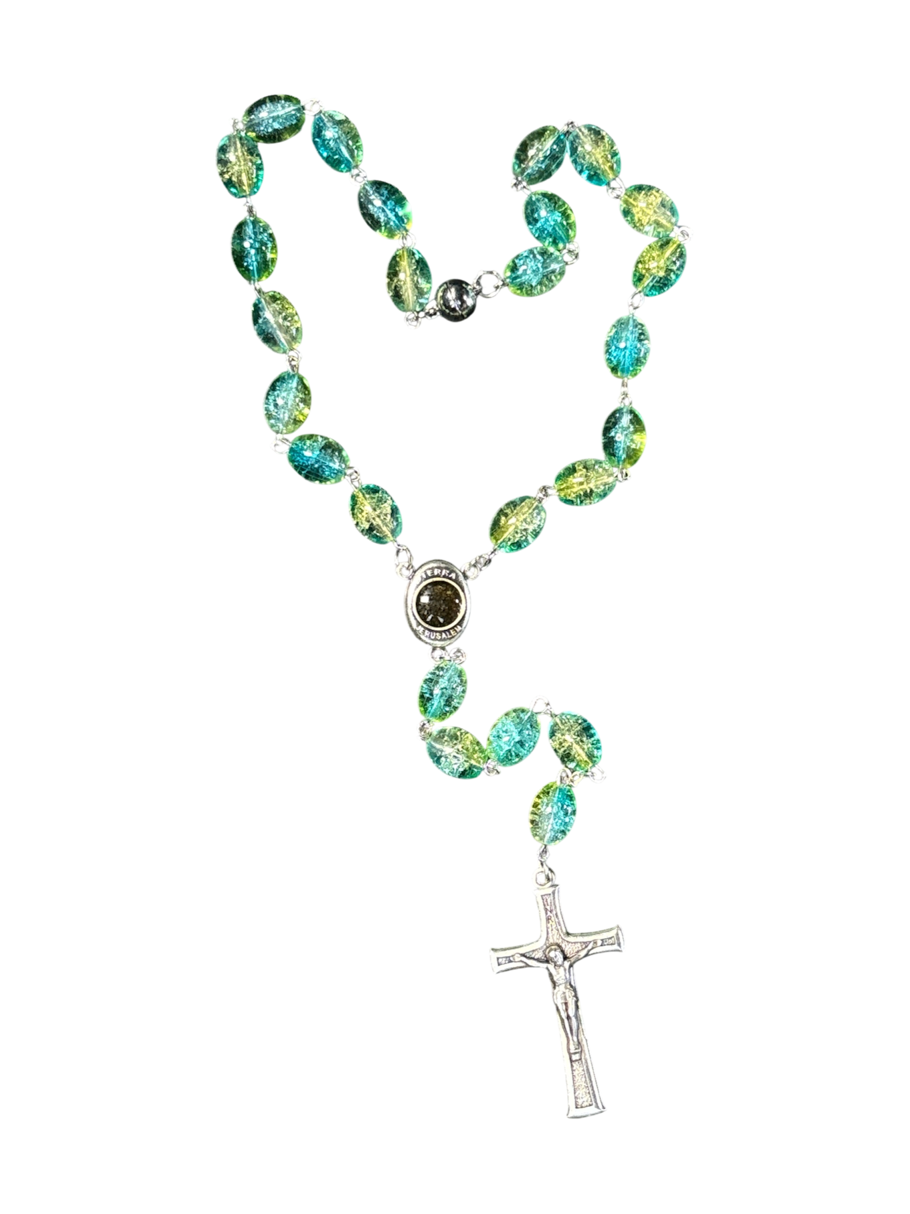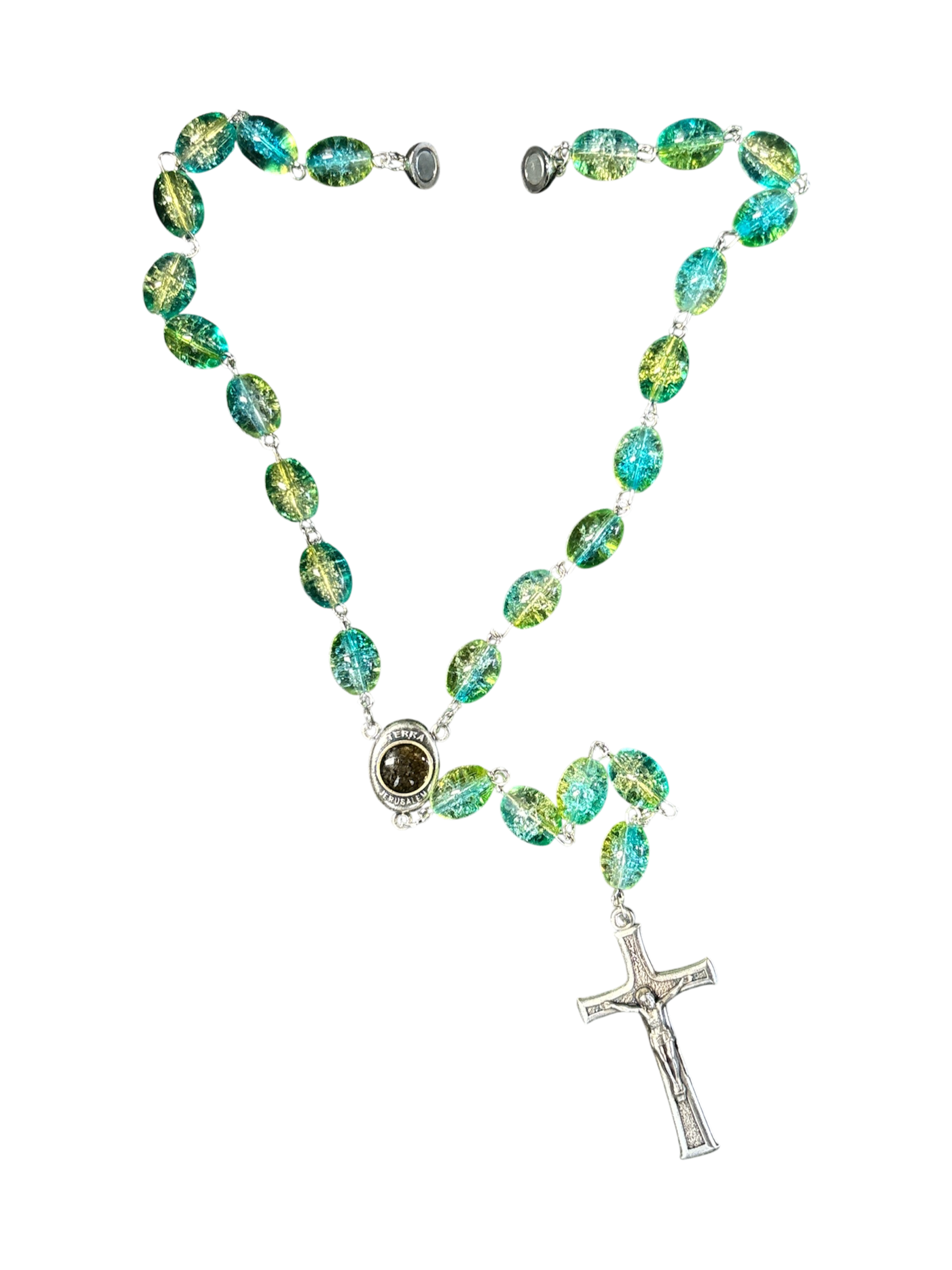 A Beautiful handmade Crystal Teal & Green Car Rosary. Hand Crafted by Christian’s in Jerusalem. These Car Rosaries are shorter than regular rosaries and has a small magnet to make it easy to hang in your car