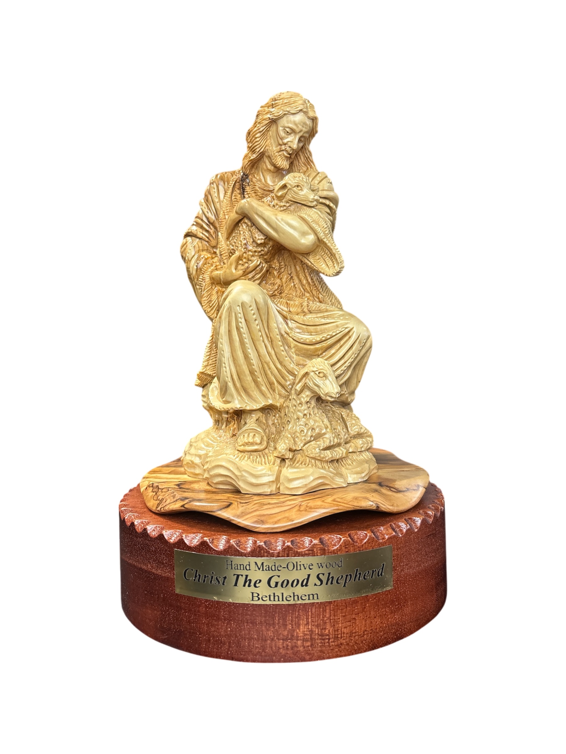 A beautiful Hand Carved Detailed Good Shepard Statue. The wood the artists use is the Olive Wood from the Holy Olive Trees.