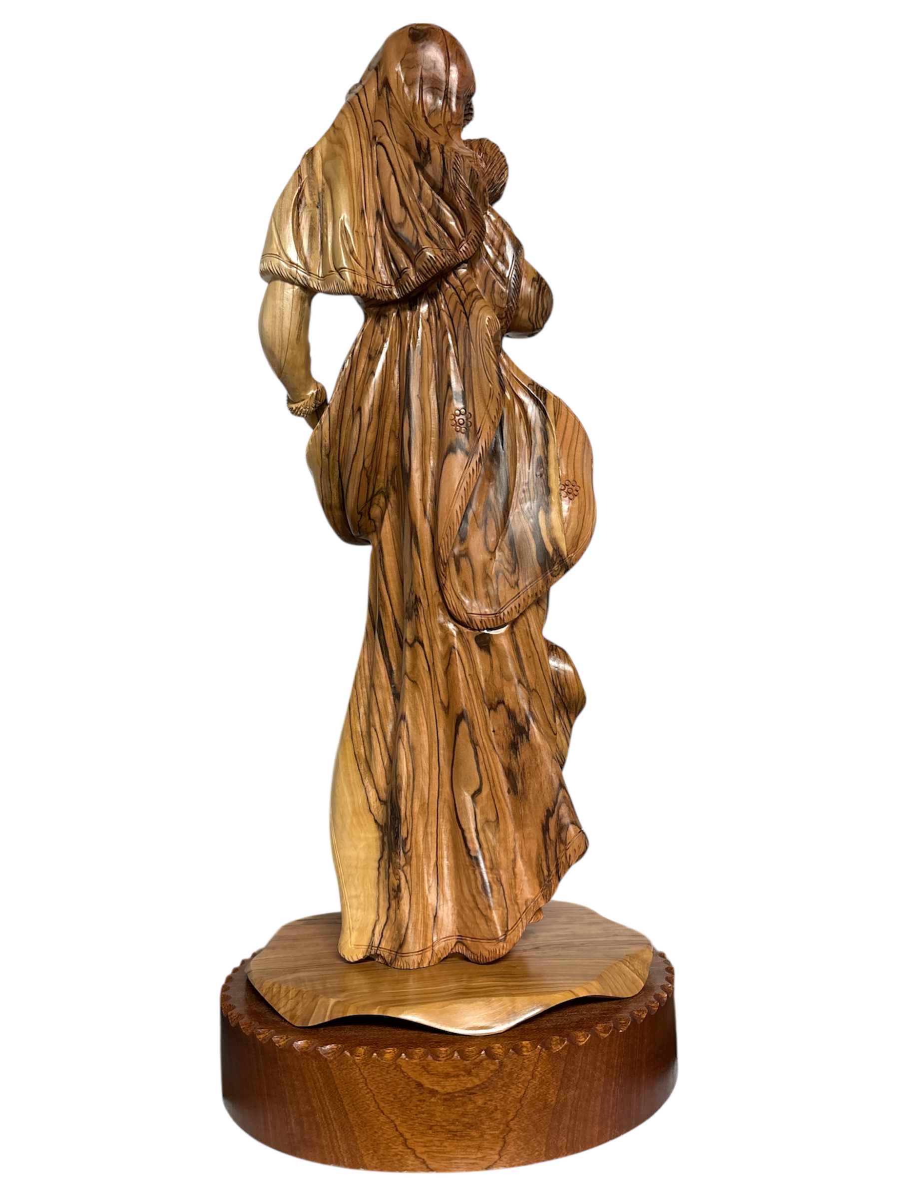A beautiful hand carved Detailed Virgin Mary with Baby Jesus. Made with Olive Wood from the Olive Trees. A beautiful Handmade statue that is signed by the Christian Artist.