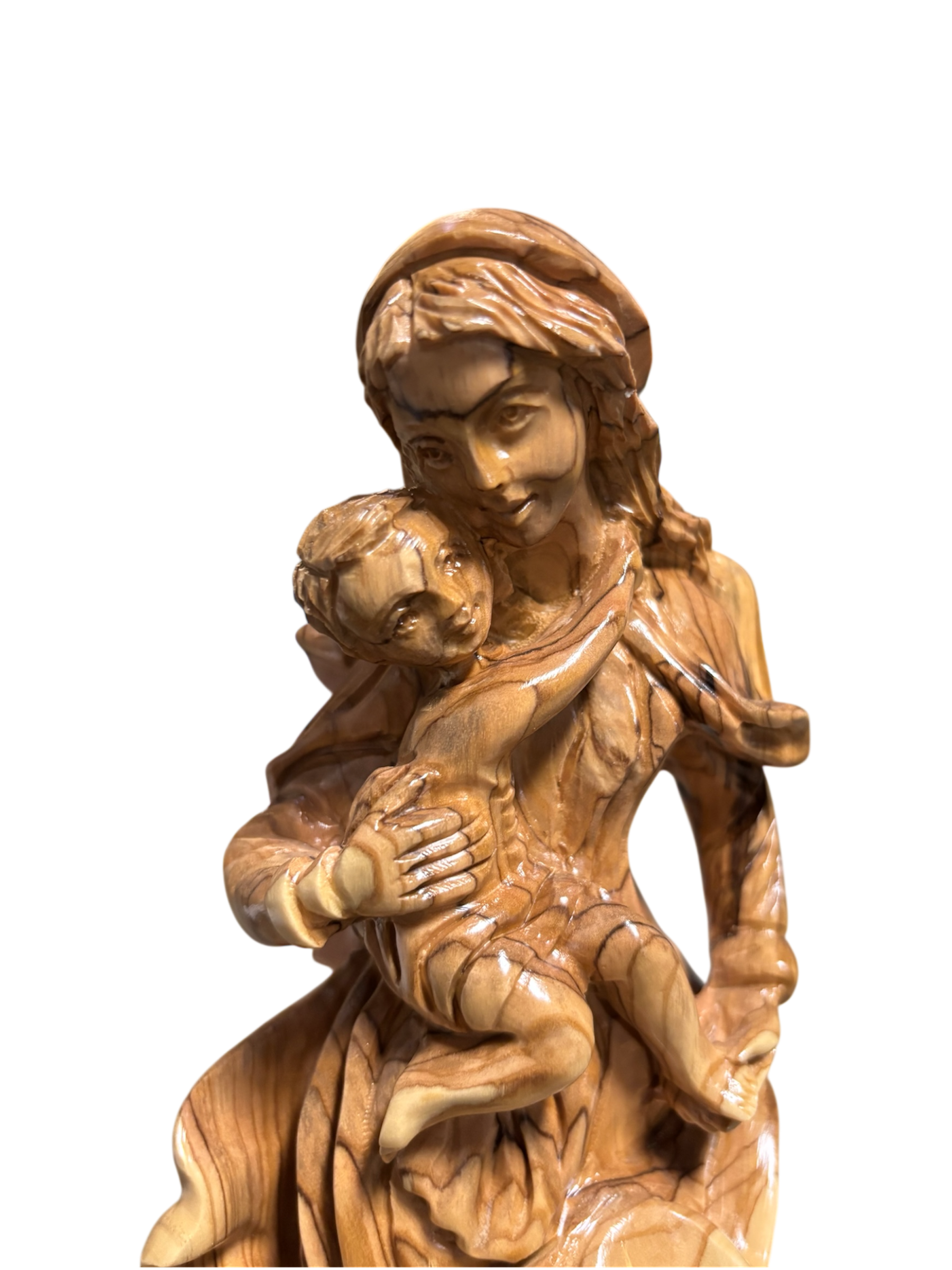 A beautiful hand carved Virgin Mary with Baby Jesus. Made with Olive Wood from the Olive Trees. A beautiful Handmade statue that is signed by the Christian Artist.